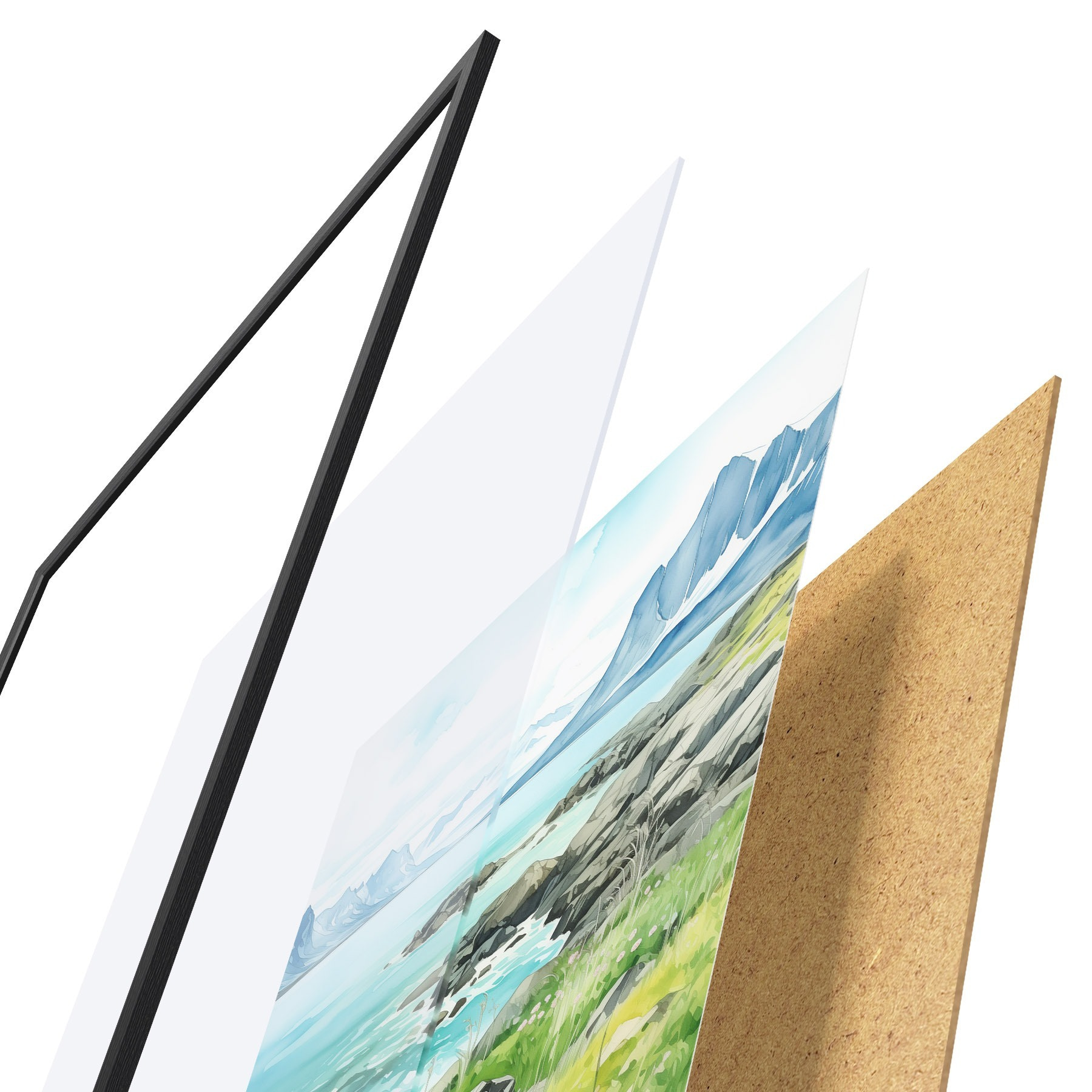 Le poster se compose d'un cadre, d'un plexiglas, d'une image imprimée et d'un support en aggloméré. Le poster peut être immédiatement accroché au mur grâce aux fixations au dos.