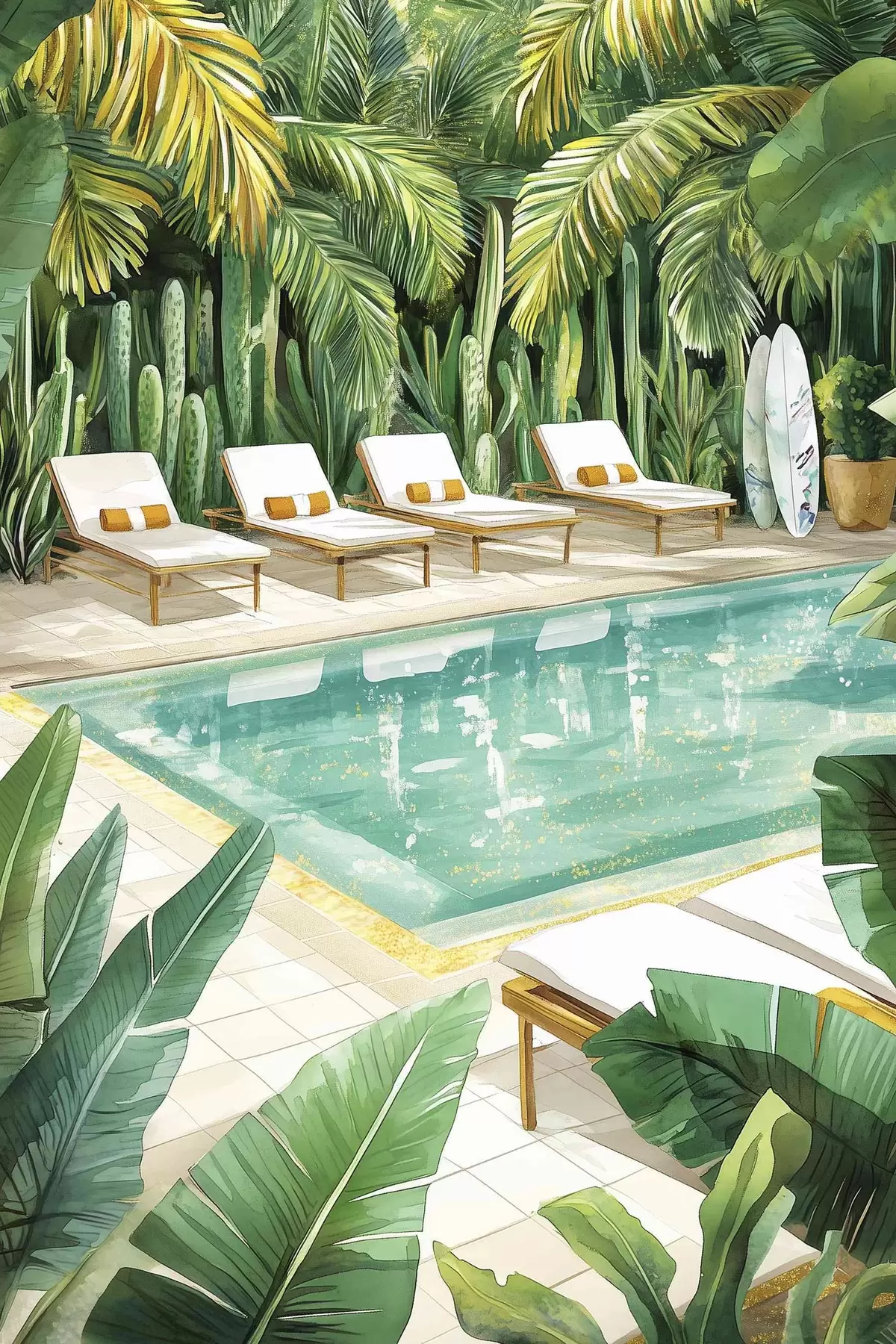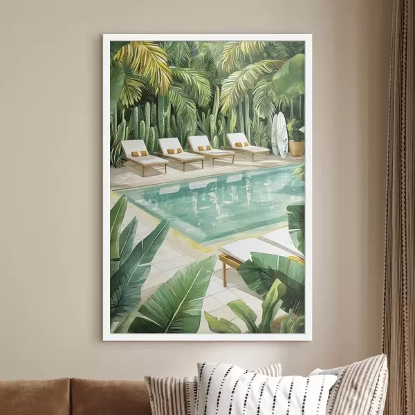 Affiche Nature tropicale, jardin, piscine d'été, surf, style aquarelle f43190