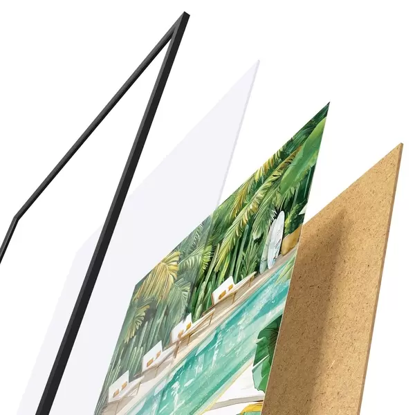 Le poster se compose d'un cadre, d'un plexiglas, d'une image imprimée et d'un support en aggloméré. Le poster peut être immédiatement accroché au mur grâce aux fixations au dos.