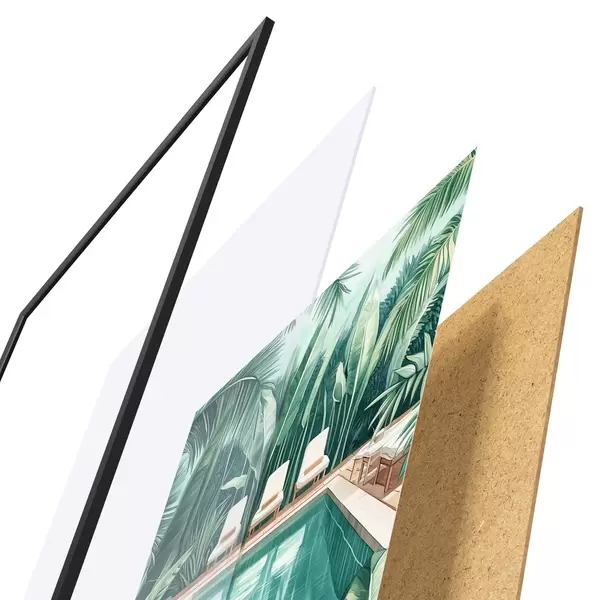 Le poster se compose d'un cadre, d'un plexiglas, d'une image imprimée et d'un support en aggloméré. Le poster peut être immédiatement accroché au mur grâce aux fixations au dos.
