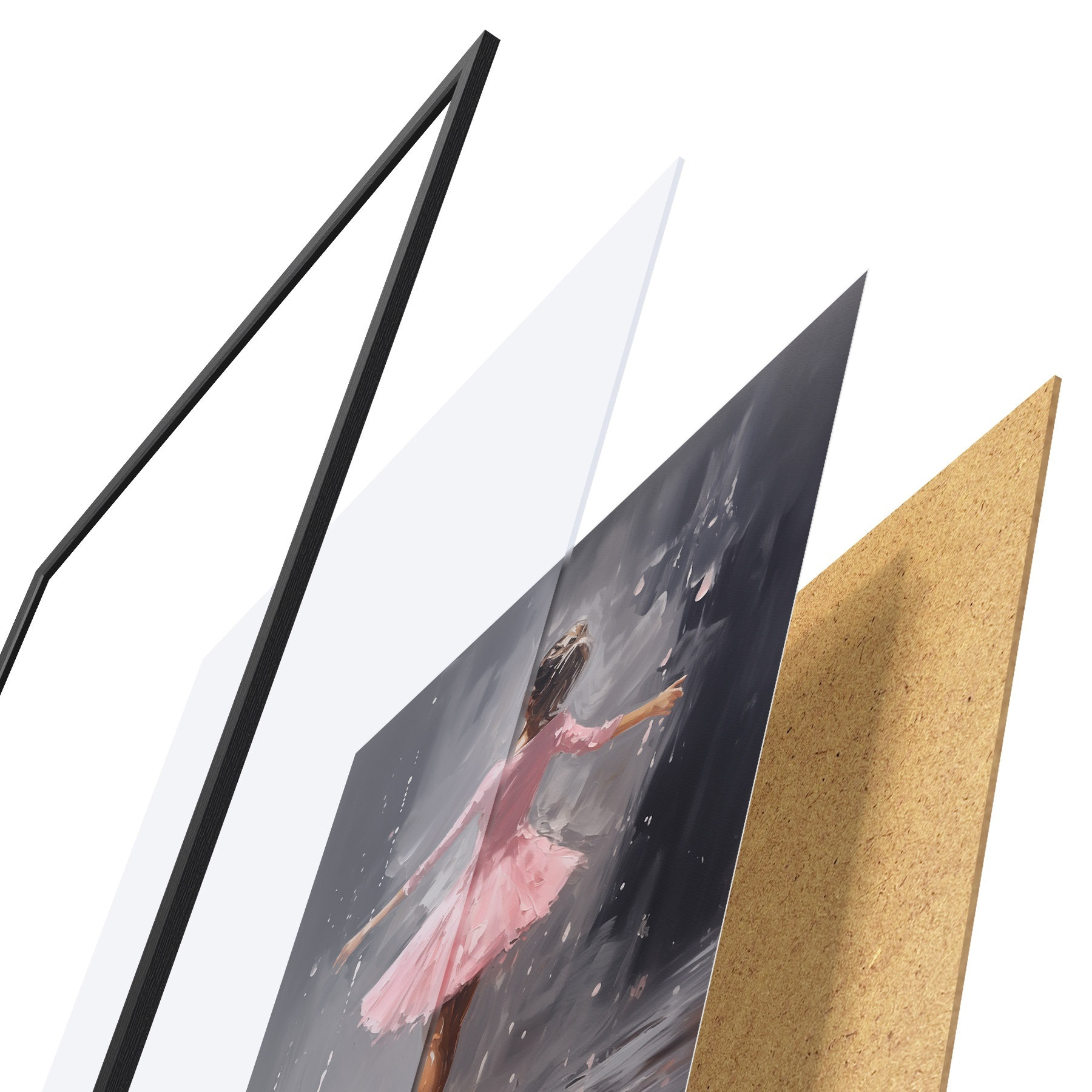 Le poster se compose d'un cadre, d'un plexiglas, d'une image imprimée et d'un support en aggloméré. Le poster peut être immédiatement accroché au mur grâce aux fixations au dos.