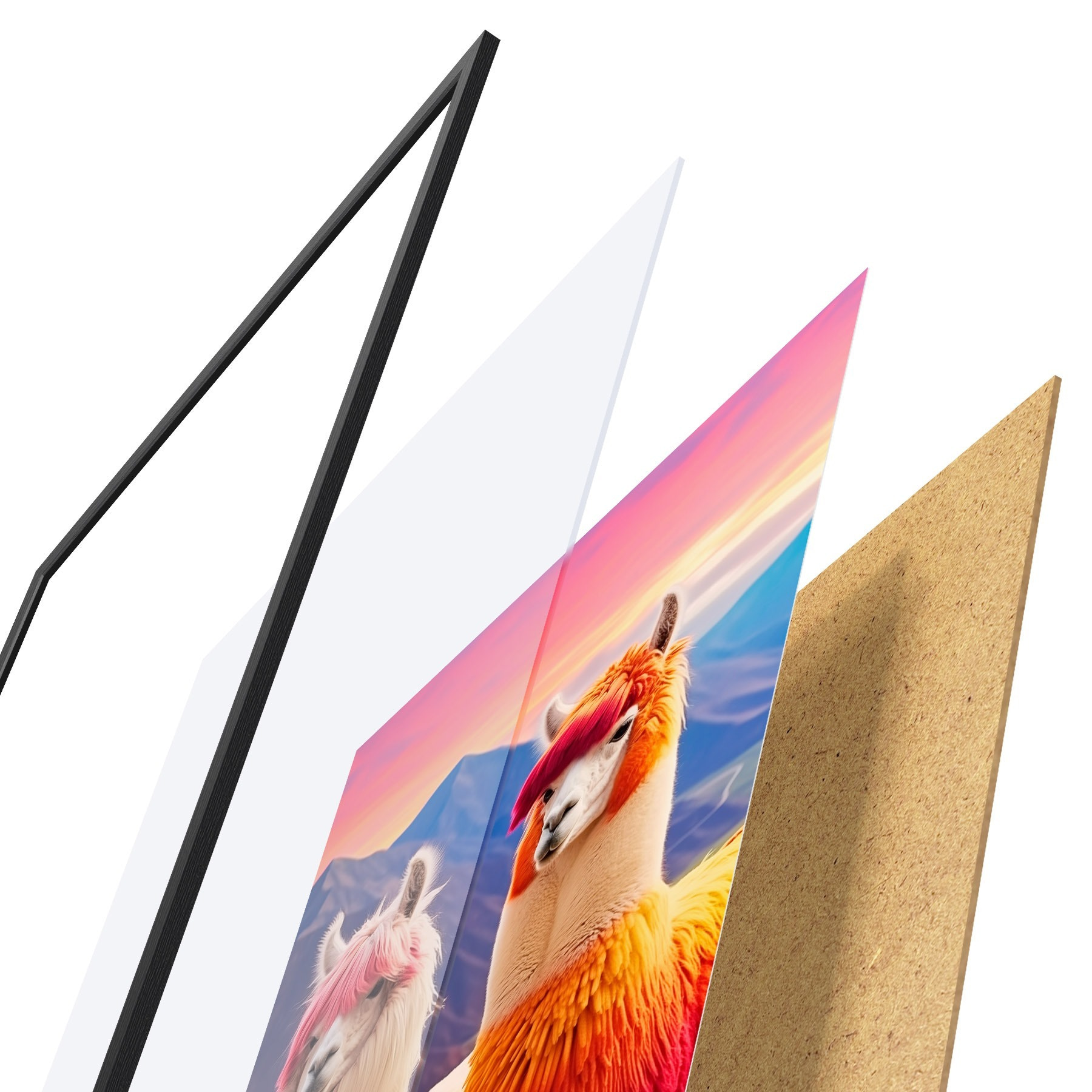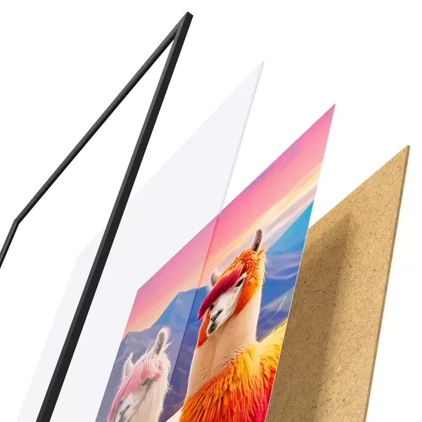 Le poster se compose d'un cadre, d'un plexiglas, d'une image imprimée et d'un support en aggloméré. Le poster peut être immédiatement accroché au mur grâce aux fixations au dos.