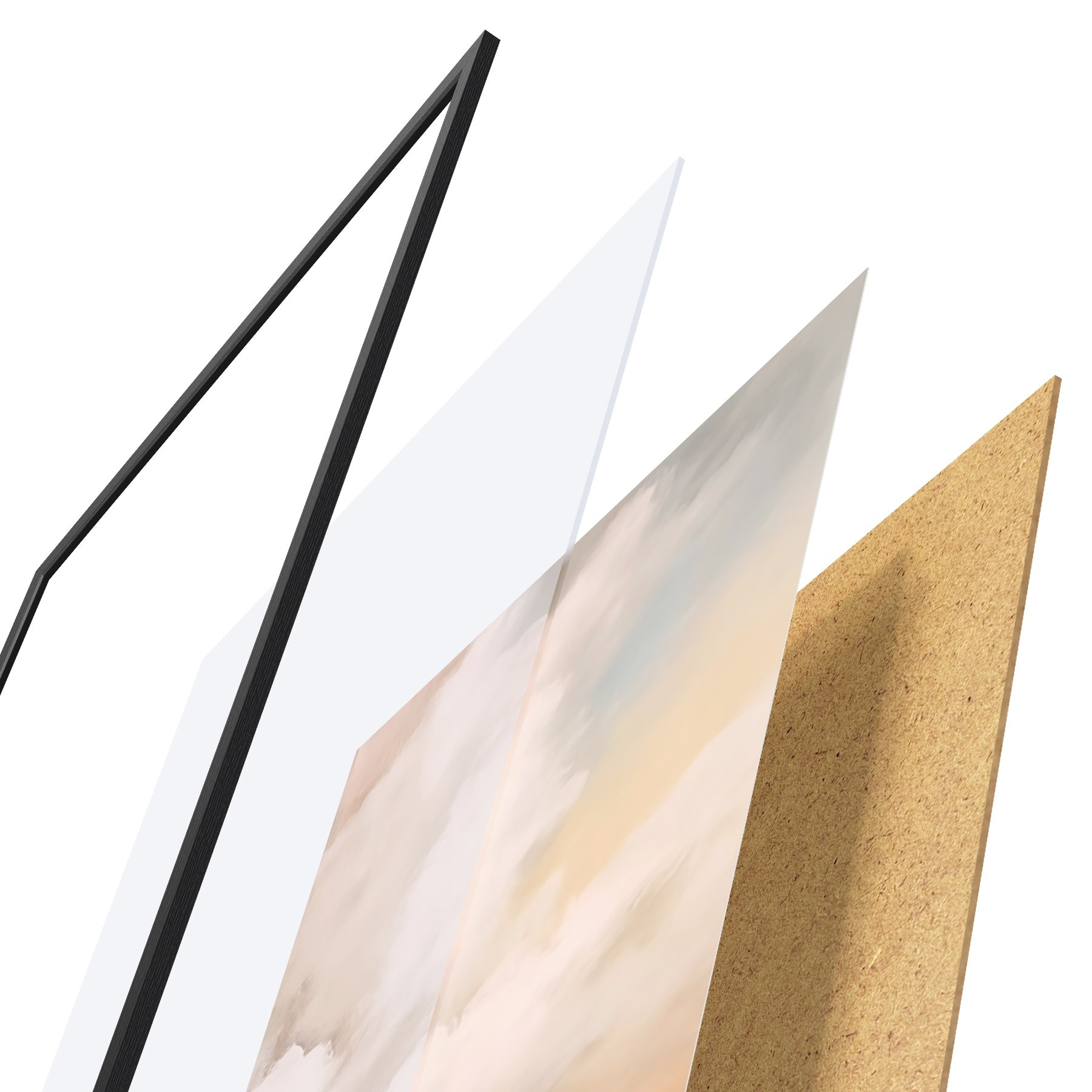 Le poster se compose d'un cadre, d'un plexiglas, d'une image imprimée et d'un support en aggloméré. Le poster peut être immédiatement accroché au mur grâce aux fixations au dos.