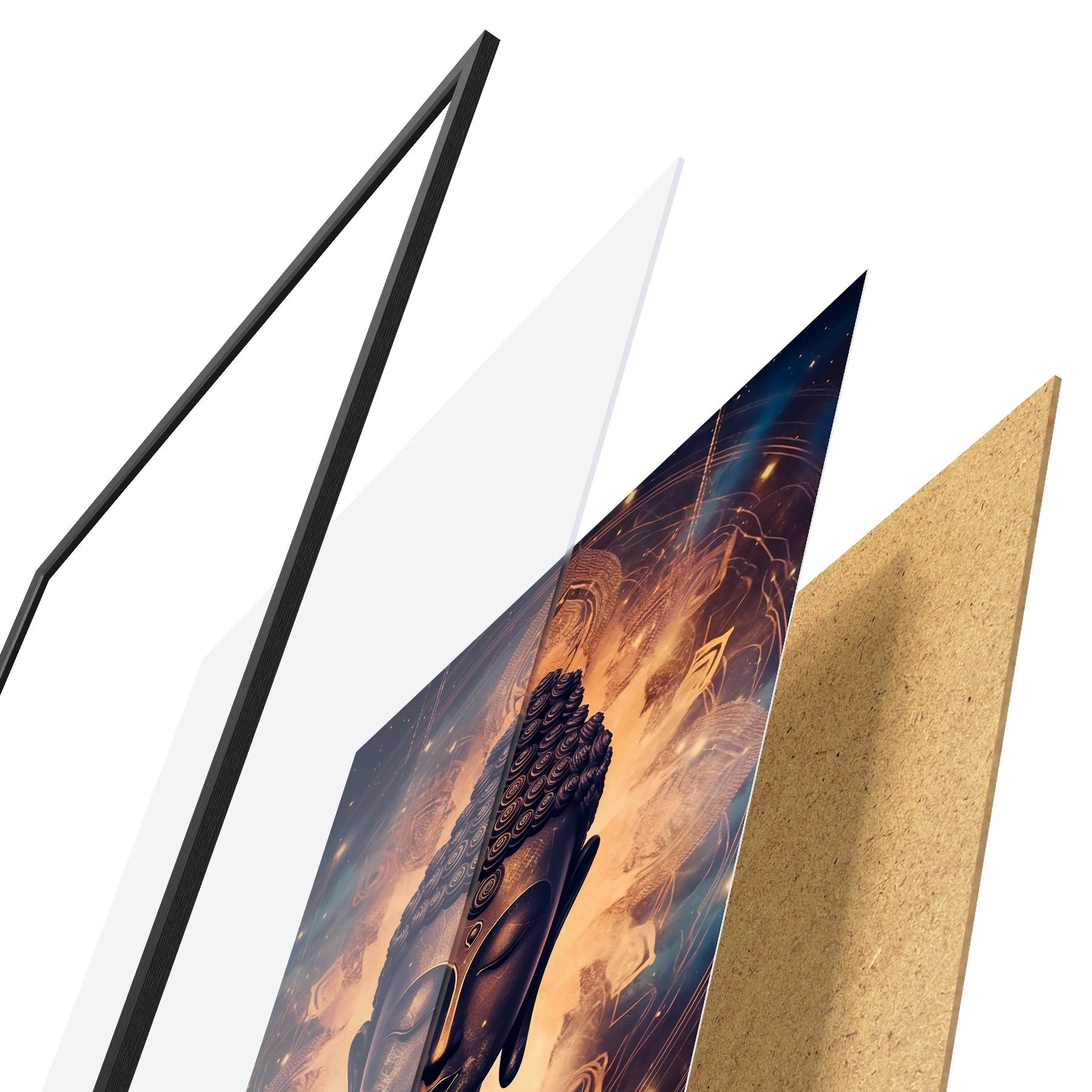 Le poster se compose d'un cadre, d'un plexiglas, d'une image imprimée et d'un support en aggloméré. Le poster peut être immédiatement accroché au mur grâce aux fixations au dos.