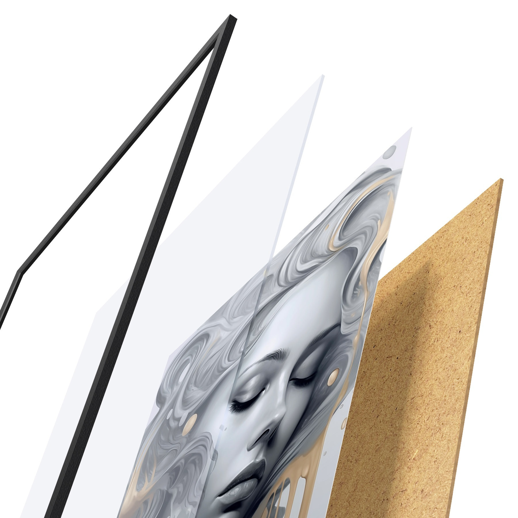 Le poster se compose d'un cadre, d'un plexiglas, d'une image imprimée et d'un support en aggloméré. Le poster peut être immédiatement accroché au mur grâce aux fixations au dos.