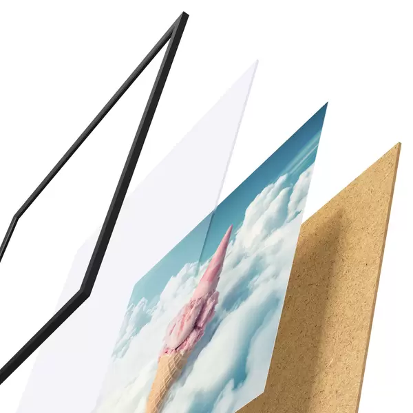 Le poster se compose d'un cadre, d'un plexiglas, d'une image imprimée et d'un support en aggloméré. Le poster peut être immédiatement accroché au mur grâce aux fixations au dos.