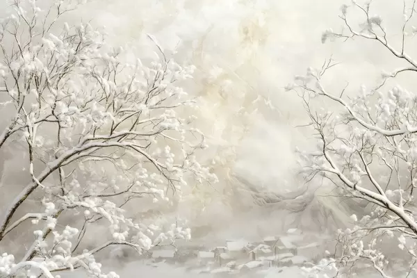 Affiche Branches d'hiver avec de la neige sur fond de village d'hiver Non f43321