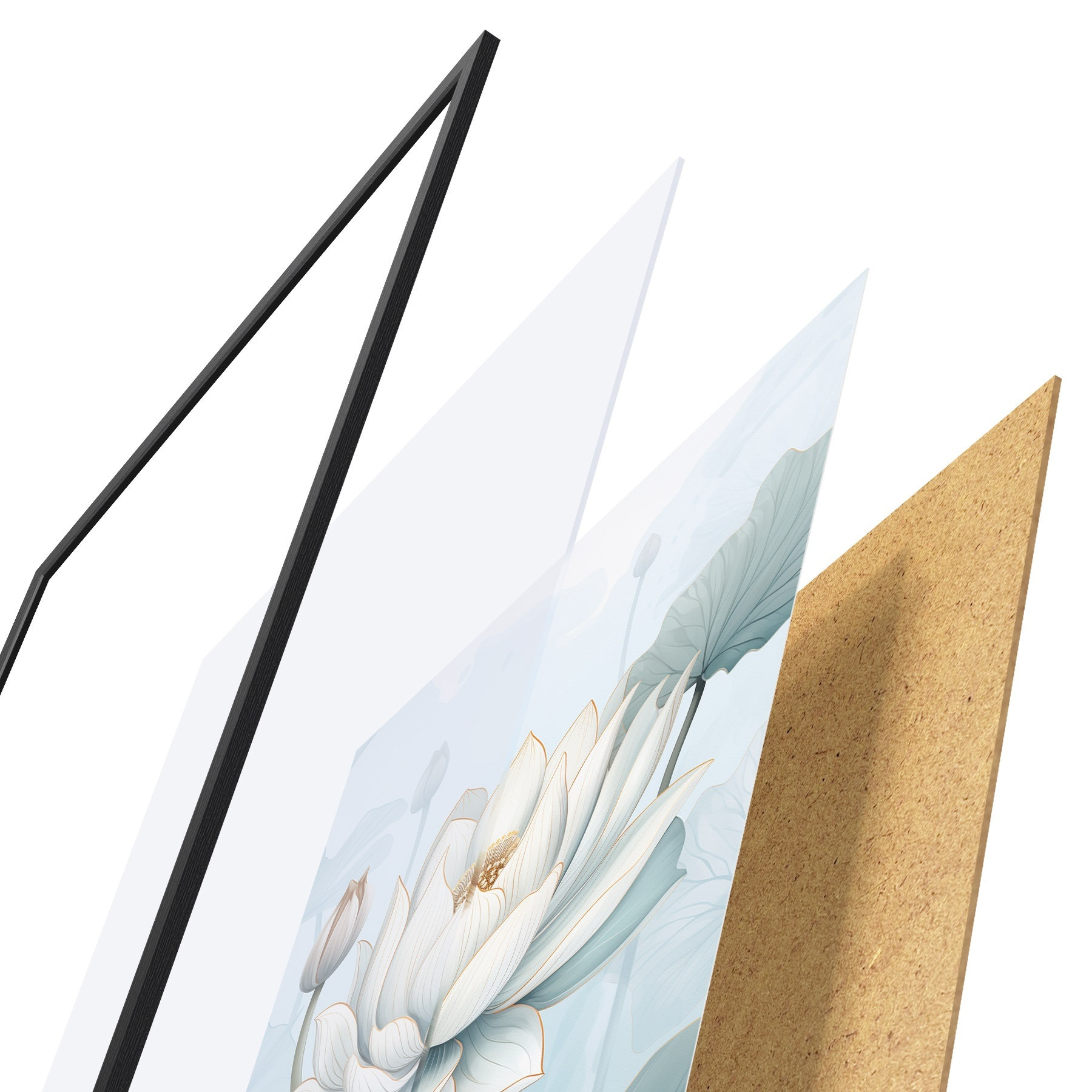 Le poster se compose d'un cadre, d'un plexiglas, d'une image imprimée et d'un support en aggloméré. Le poster peut être immédiatement accroché au mur grâce aux fixations au dos.