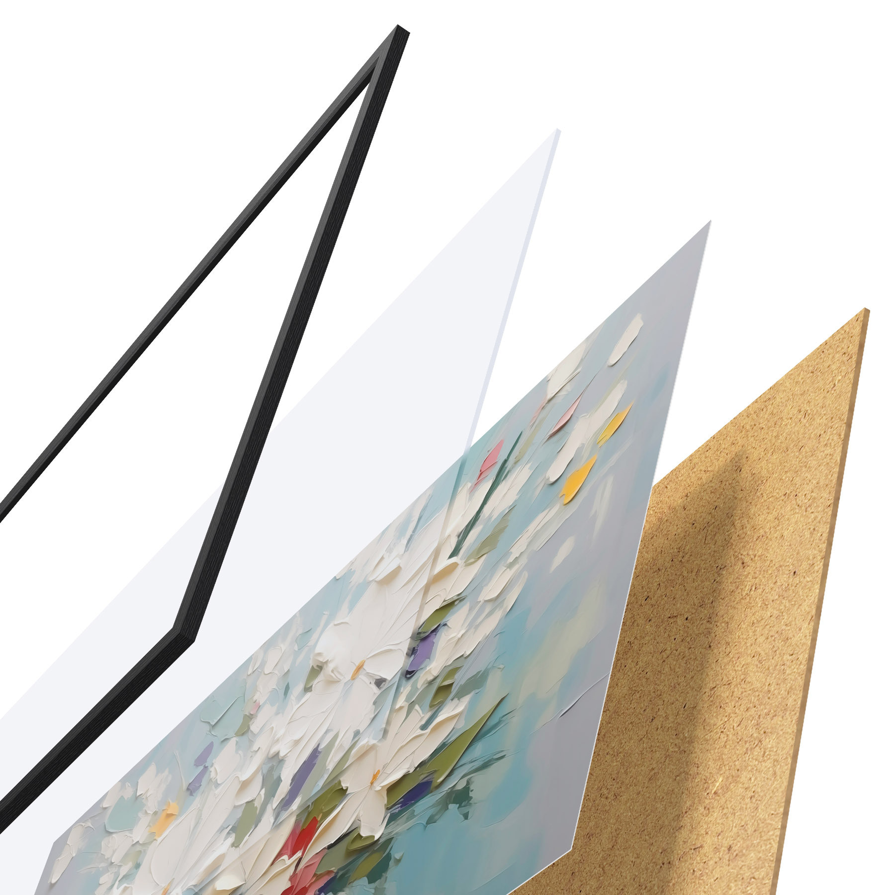 Le poster se compose d'un cadre, d'un plexiglas, d'une image imprimée et d'un support en aggloméré. Le poster peut être immédiatement accroché au mur grâce aux fixations au dos.