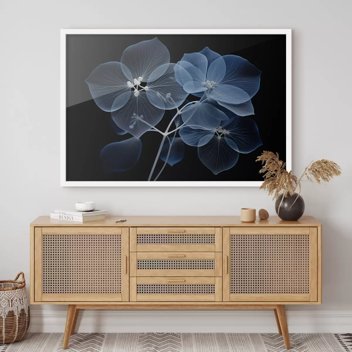 Affiche Une fleur d'hortensia bleu translucide avec des étamines bleues et une tige délicate, sur un fond noir Non f43395
