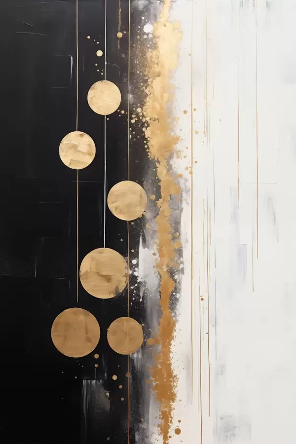 Affiche Art abstrait avec des cercles jaunes suspendus sur un fond noir et blanc avec des taches blanches et jaunes f43410