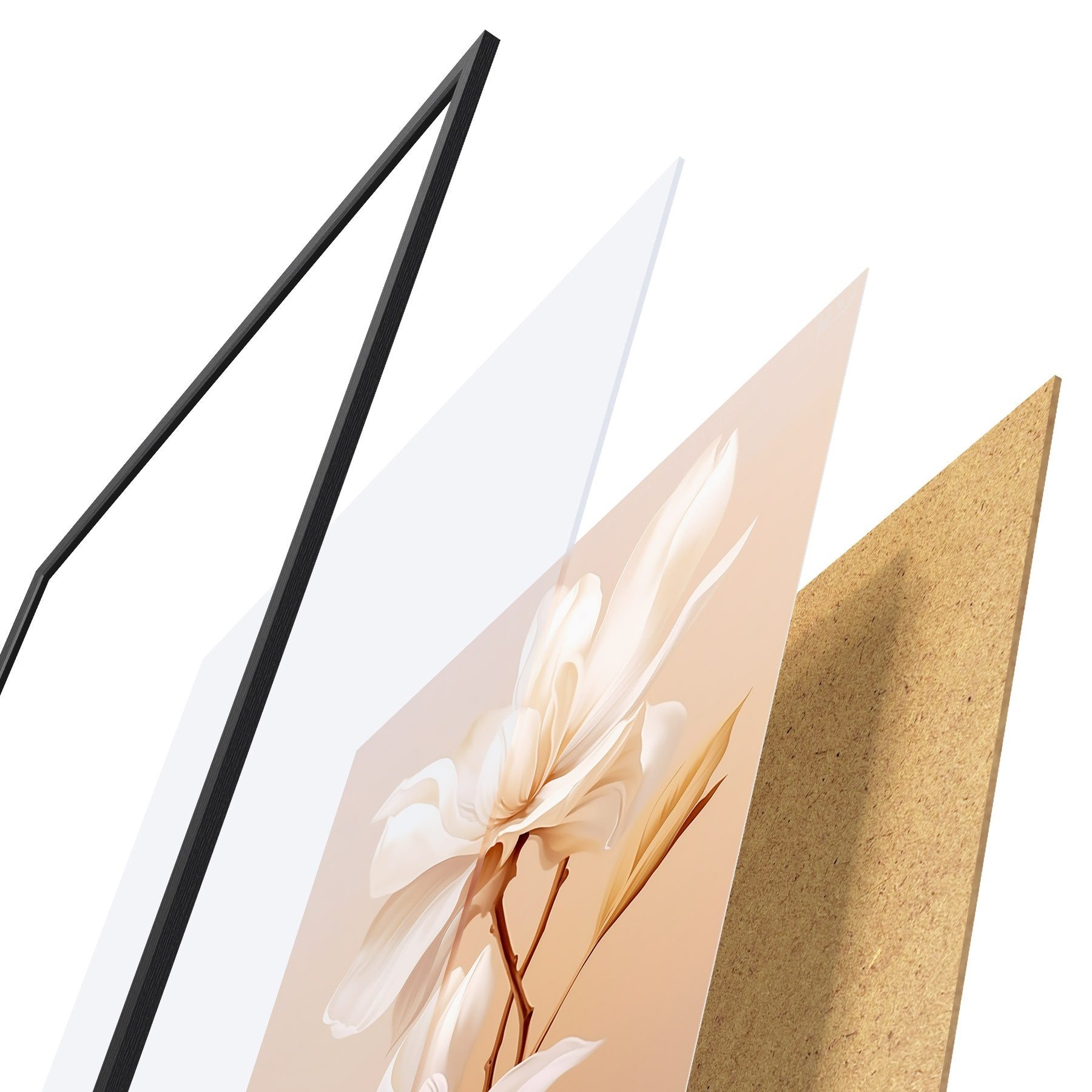 Le poster se compose d'un cadre, d'un plexiglas, d'une image imprimée et d'un support en aggloméré. Le poster peut être immédiatement accroché au mur grâce aux fixations au dos.