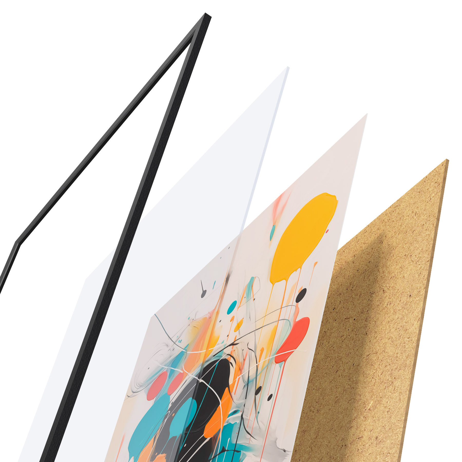 Le poster se compose d'un cadre, d'un plexiglas, d'une image imprimée et d'un support en aggloméré. Le poster peut être immédiatement accroché au mur grâce aux fixations au dos.