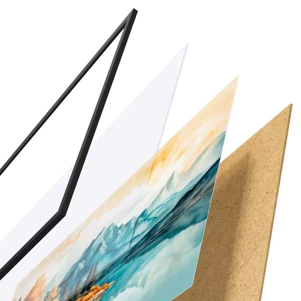 Le poster se compose d'un cadre, d'un plexiglas, d'une image imprimée et d'un support en aggloméré. Le poster peut être immédiatement accroché au mur grâce aux fixations au dos.