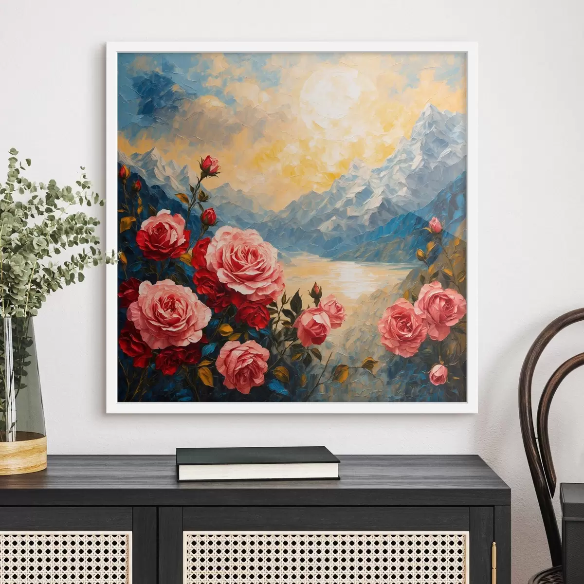 Affiche Roses sur fond de montagnes dans le style de la peinture à l'huile f43457