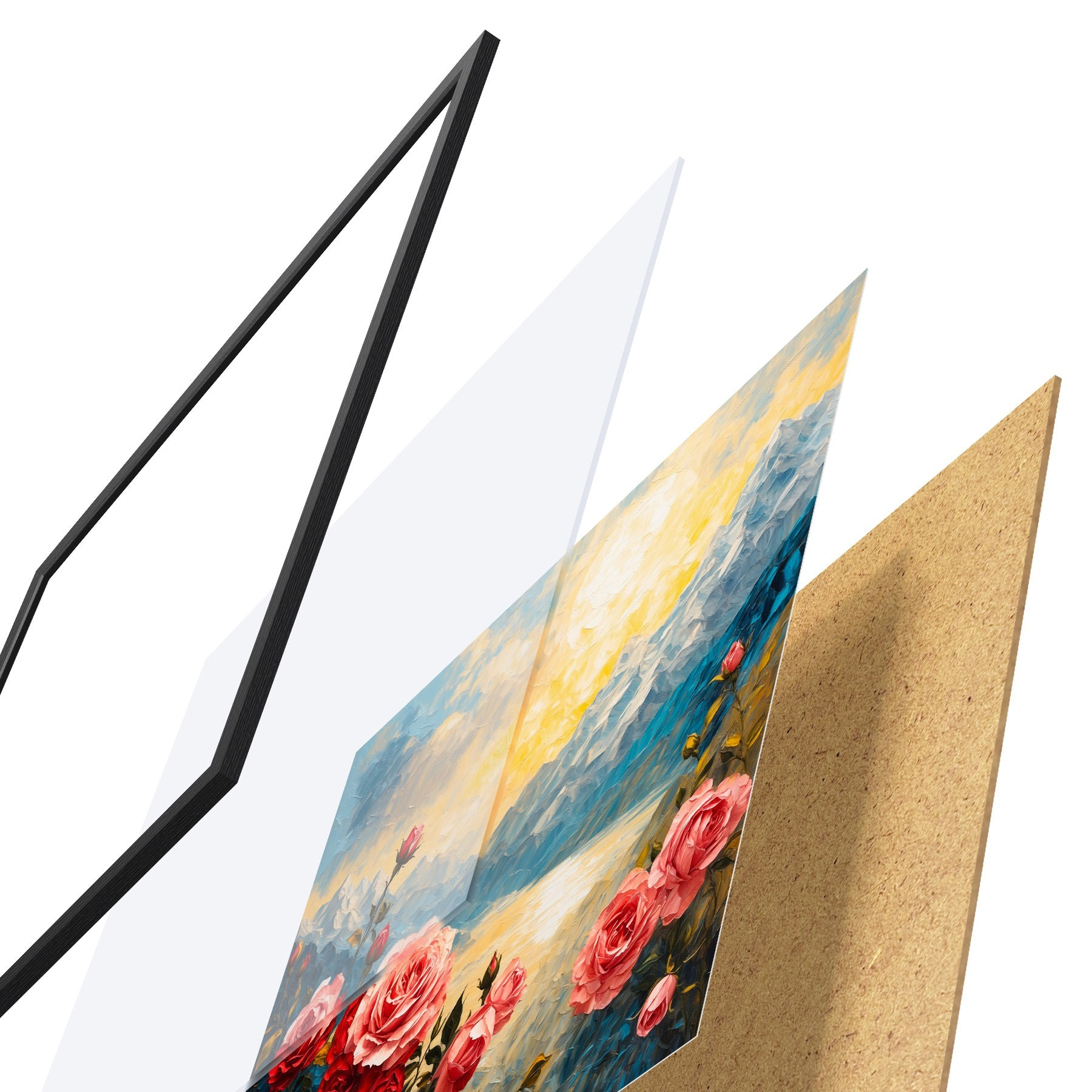 Le poster se compose d'un cadre, d'un plexiglas, d'une image imprimée et d'un support en aggloméré. Le poster peut être immédiatement accroché au mur grâce aux fixations au dos.