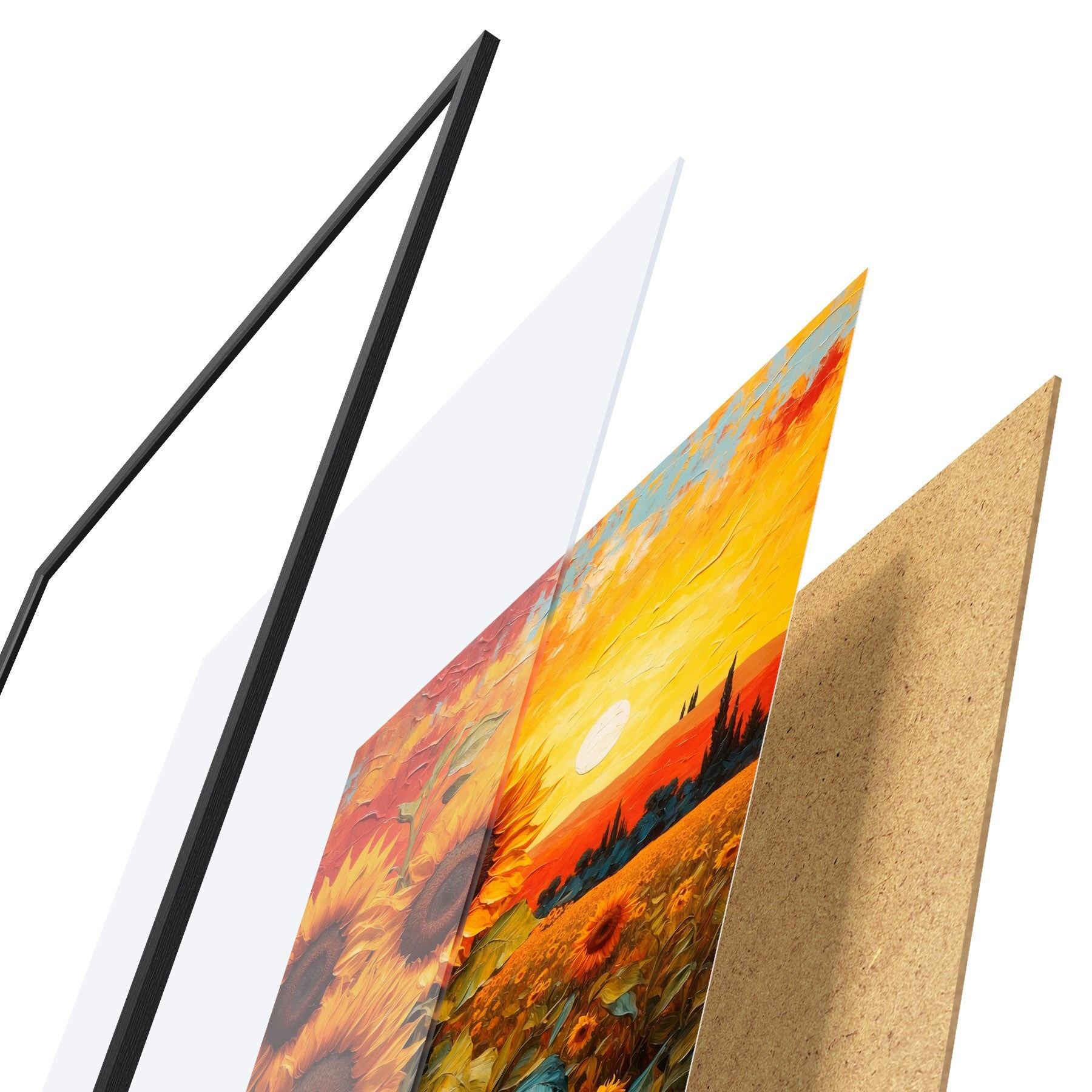 Le poster se compose d'un cadre, d'un plexiglas, d'une image imprimée et d'un support en aggloméré. Le poster peut être immédiatement accroché au mur grâce aux fixations au dos.