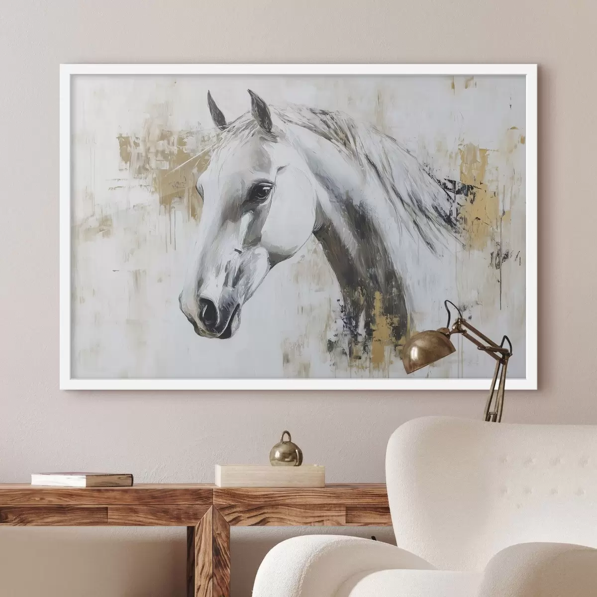 Affiche Cheval blanc, dessin à l'huile, animaux, coups de pinceau vifs f43497