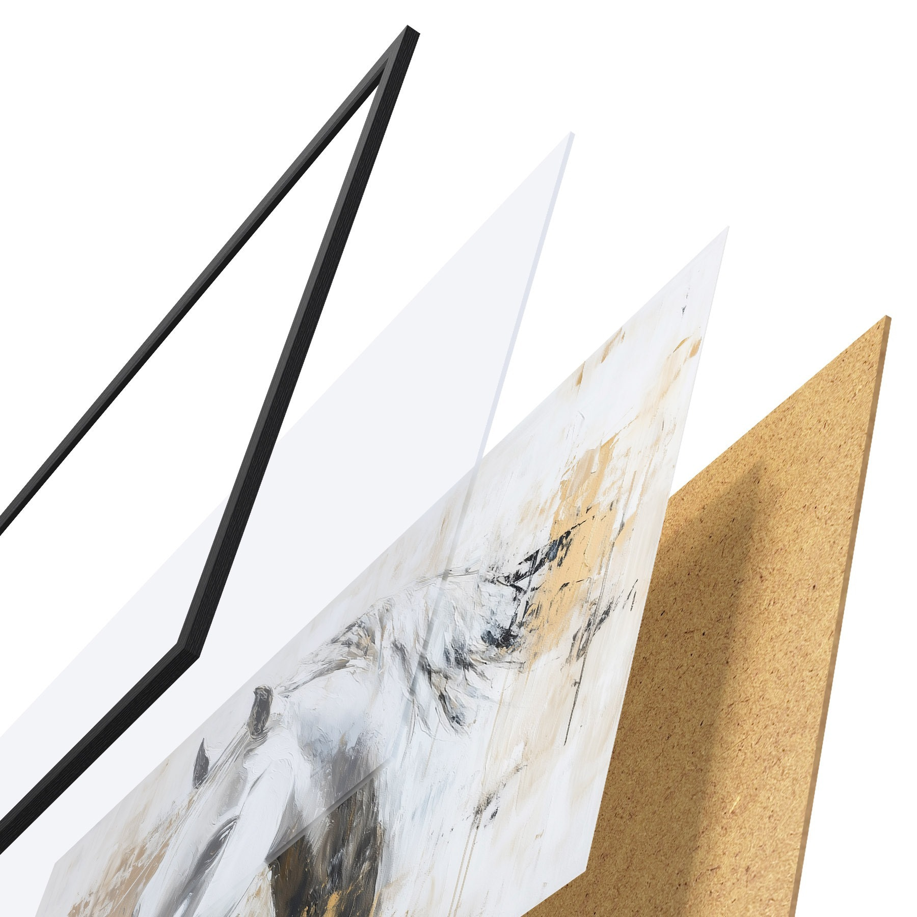 Le poster se compose d'un cadre, d'un plexiglas, d'une image imprimée et d'un support en aggloméré. Le poster peut être immédiatement accroché au mur grâce aux fixations au dos.