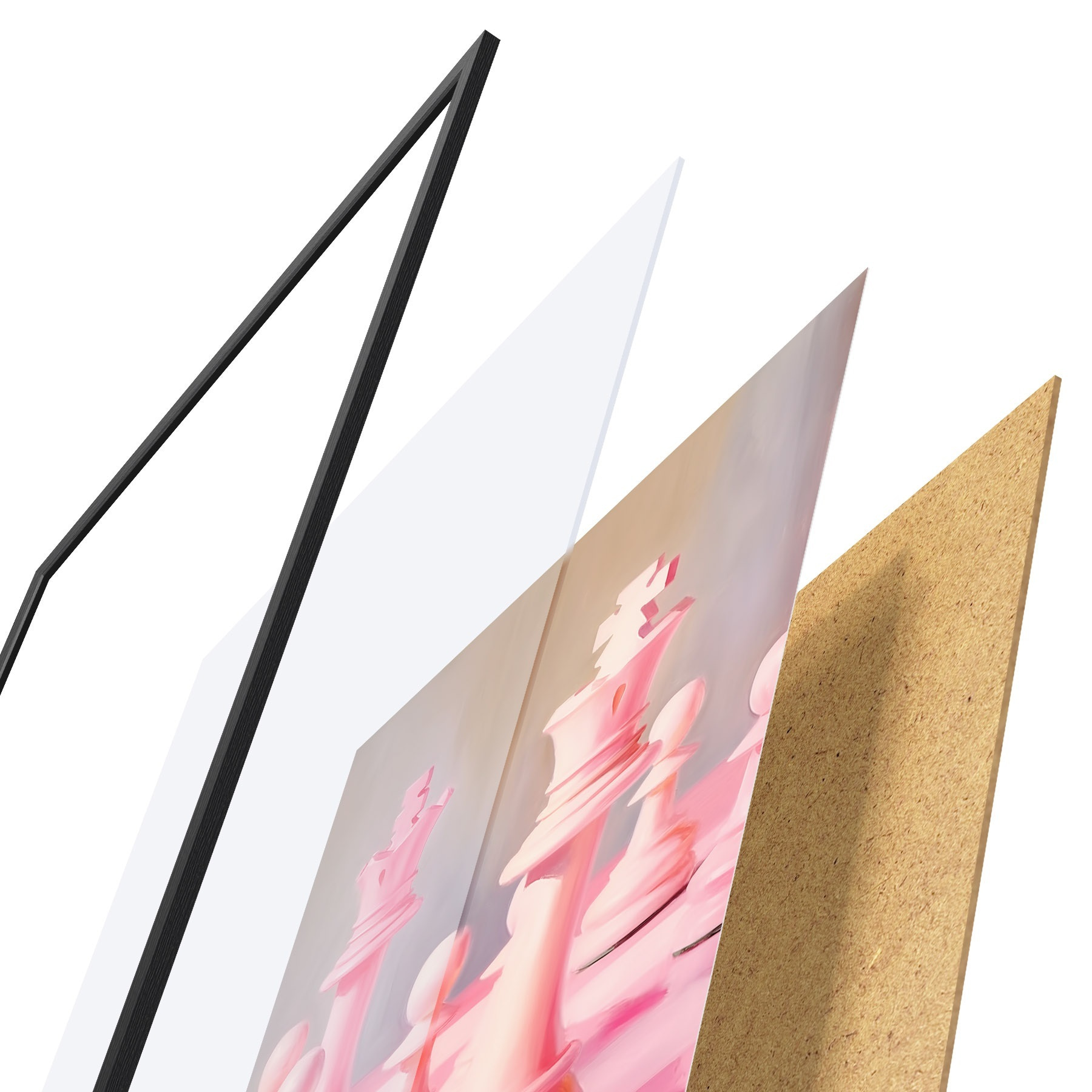 Le poster se compose d'un cadre, d'un plexiglas, d'une image imprimée et d'un support en aggloméré. Le poster peut être immédiatement accroché au mur grâce aux fixations au dos.