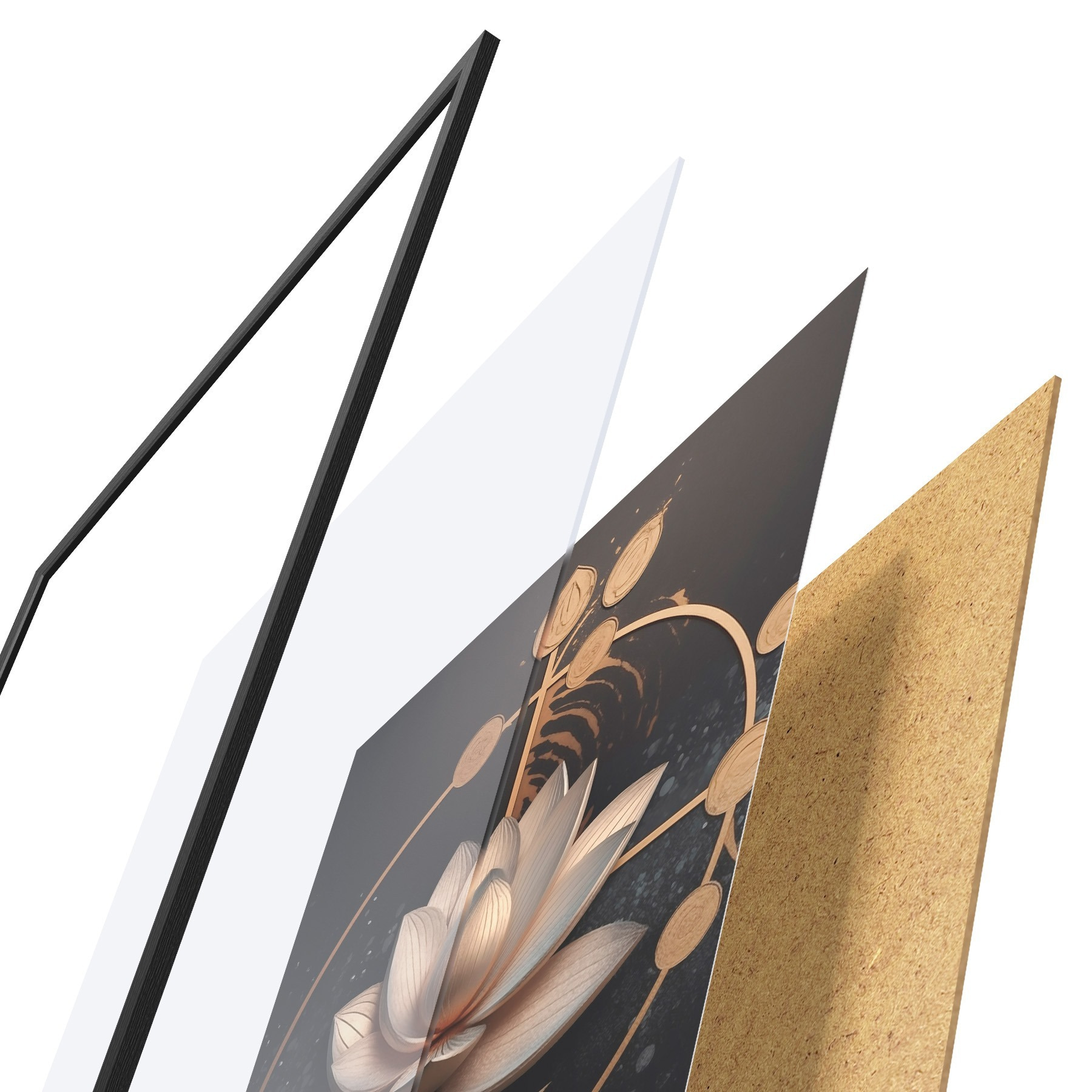 Le poster se compose d'un cadre, d'un plexiglas, d'une image imprimée et d'un support en aggloméré. Le poster peut être immédiatement accroché au mur grâce aux fixations au dos.