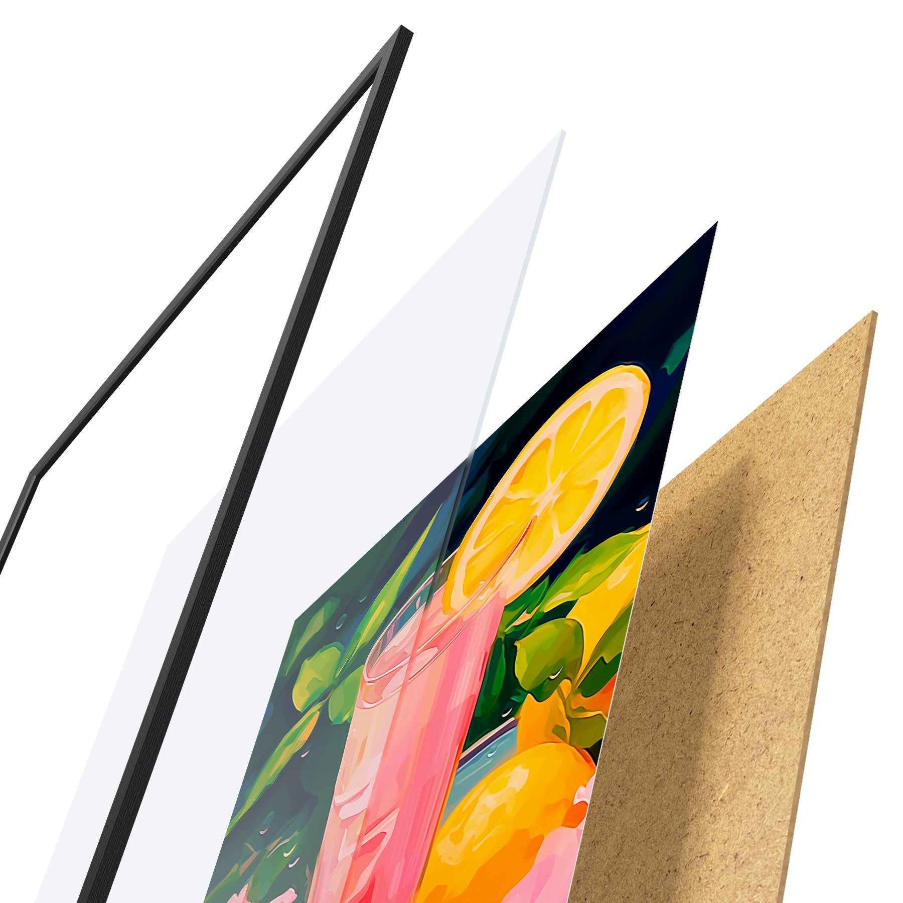 Le poster se compose d'un cadre, d'un plexiglas, d'une image imprimée et d'un support en aggloméré. Le poster peut être immédiatement accroché au mur grâce aux fixations au dos.