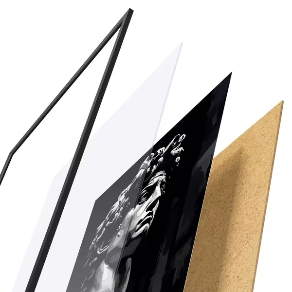 Le poster se compose d'un cadre, d'un plexiglas, d'une image imprimée et d'un support en aggloméré. Le poster peut être immédiatement accroché au mur grâce aux fixations au dos.