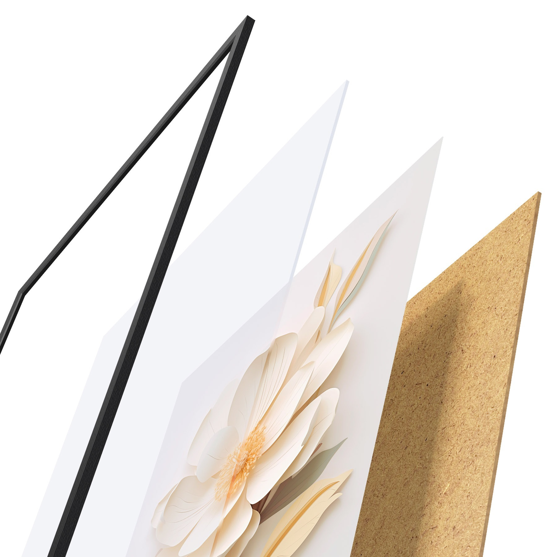 Le poster se compose d'un cadre, d'un plexiglas, d'une image imprimée et d'un support en aggloméré. Le poster peut être immédiatement accroché au mur grâce aux fixations au dos.