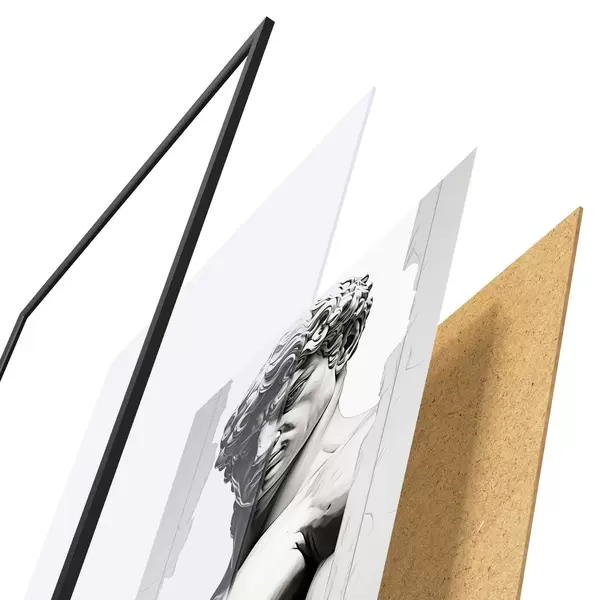 Le poster se compose d'un cadre, d'un plexiglas, d'une image imprimée et d'un support en aggloméré. Le poster peut être immédiatement accroché au mur grâce aux fixations au dos.