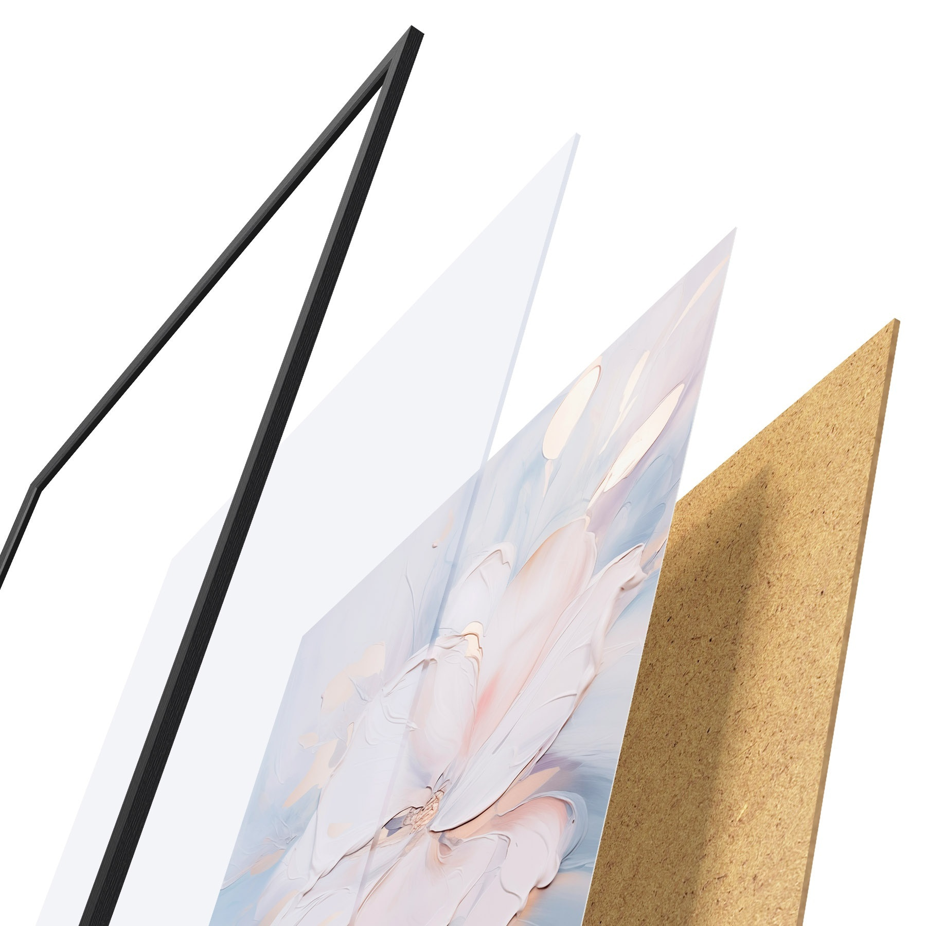 Le poster se compose d'un cadre, d'un plexiglas, d'une image imprimée et d'un support en aggloméré. Le poster peut être immédiatement accroché au mur grâce aux fixations au dos.