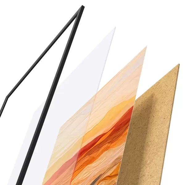 Le poster se compose d'un cadre, d'un plexiglas, d'une image imprimée et d'un support en aggloméré. Le poster peut être immédiatement accroché au mur grâce aux fixations au dos.