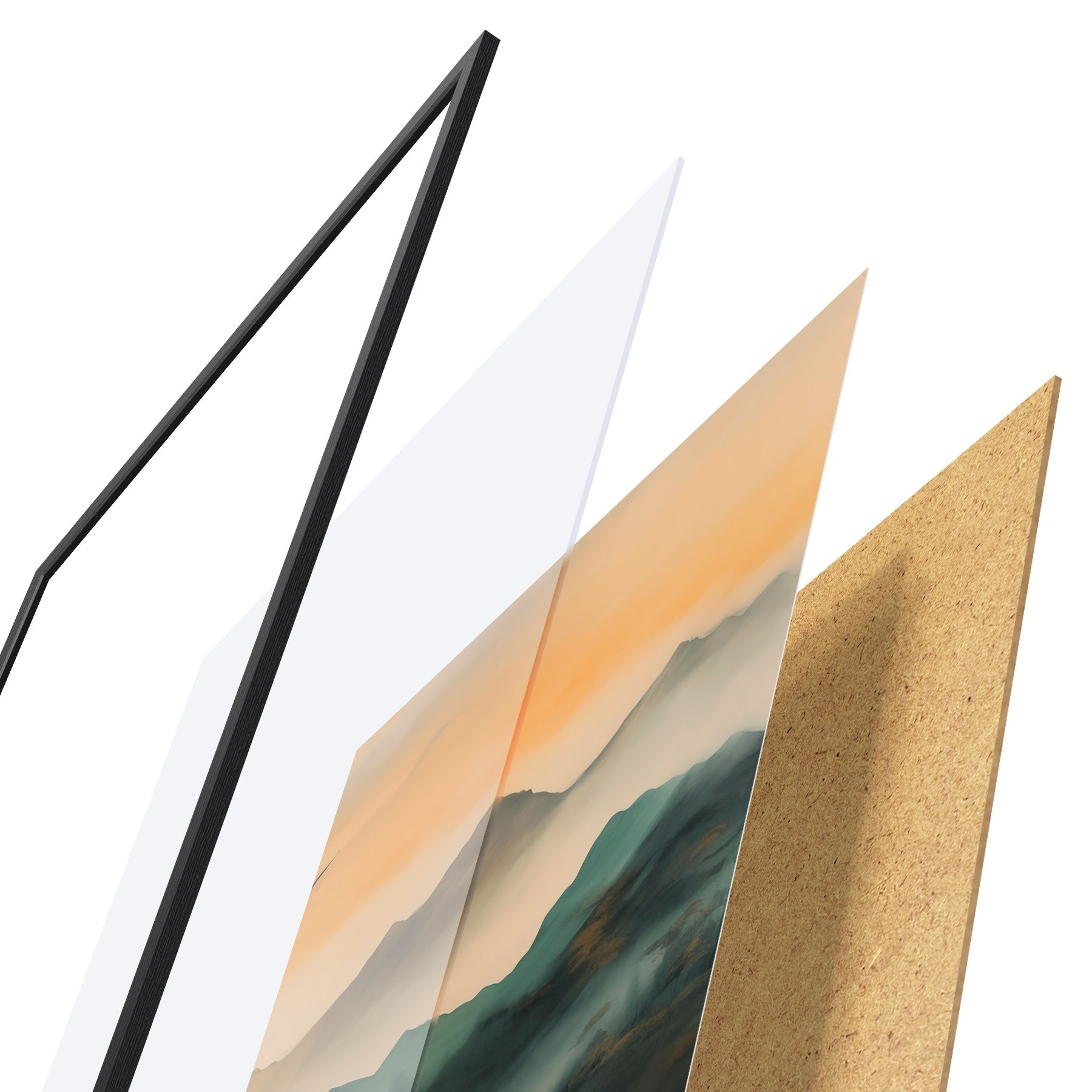 Le poster se compose d'un cadre, d'un plexiglas, d'une image imprimée et d'un support en aggloméré. Le poster peut être immédiatement accroché au mur grâce aux fixations au dos.