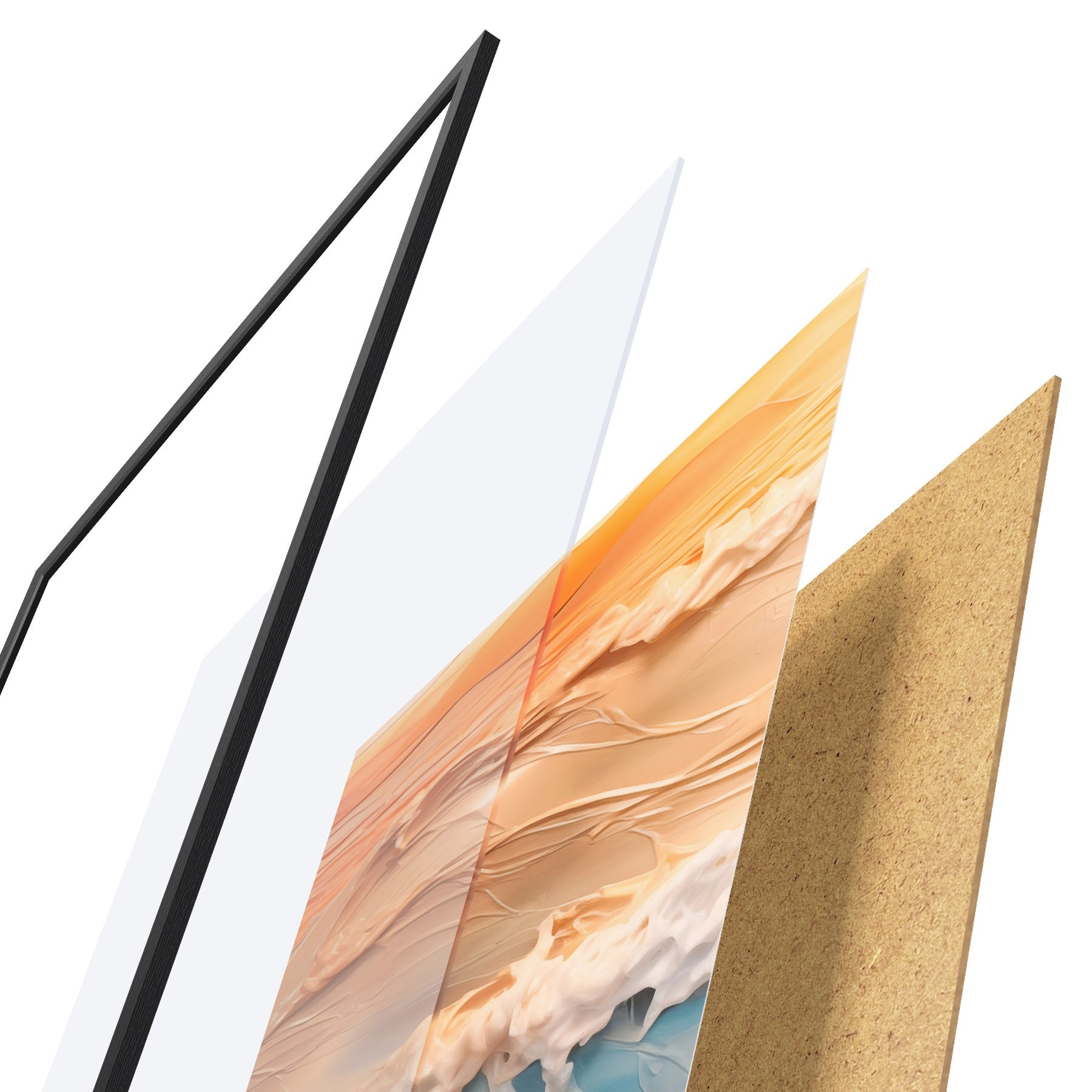 Le poster se compose d'un cadre, d'un plexiglas, d'une image imprimée et d'un support en aggloméré. Le poster peut être immédiatement accroché au mur grâce aux fixations au dos.