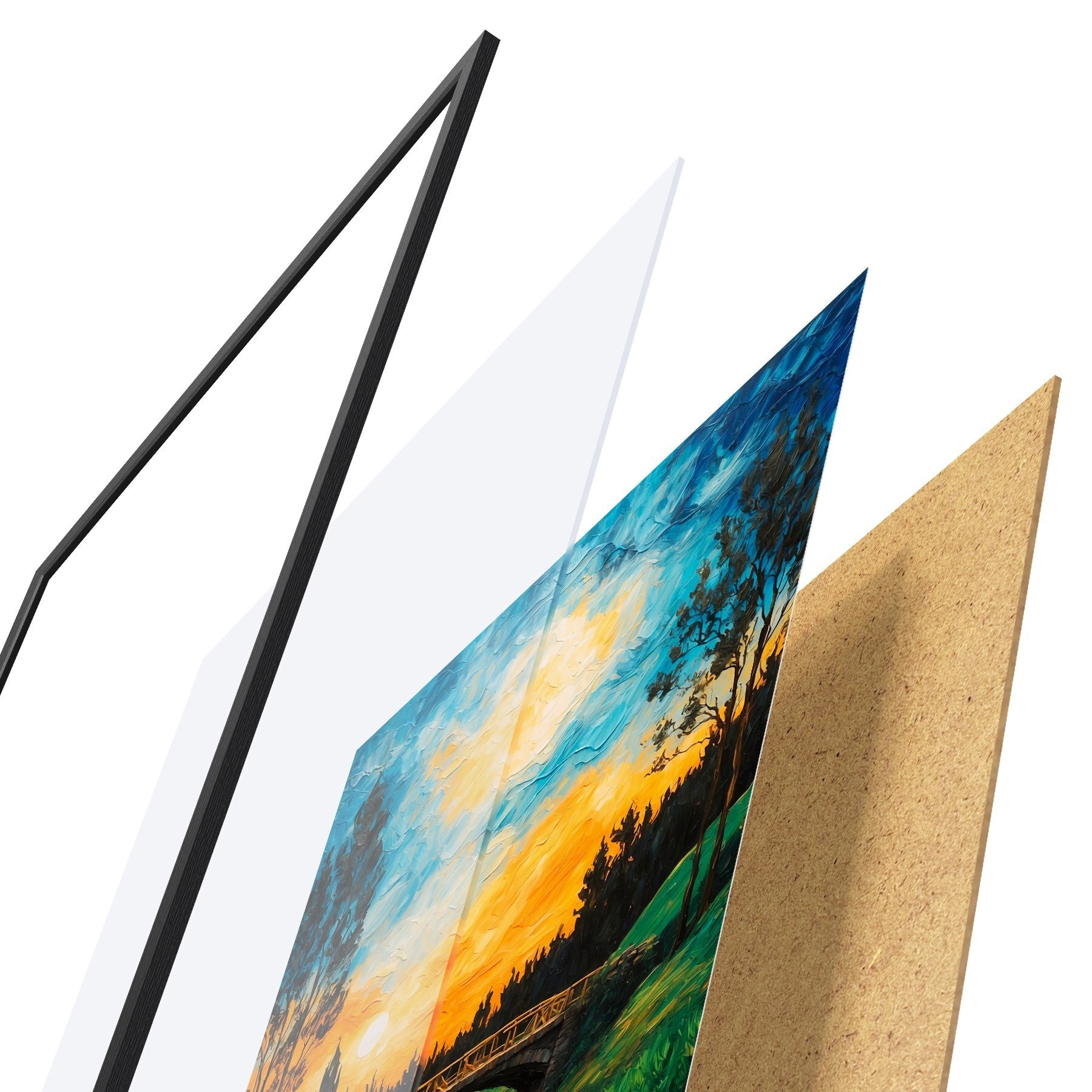 Le poster se compose d'un cadre, d'un plexiglas, d'une image imprimée et d'un support en aggloméré. Le poster peut être immédiatement accroché au mur grâce aux fixations au dos.
