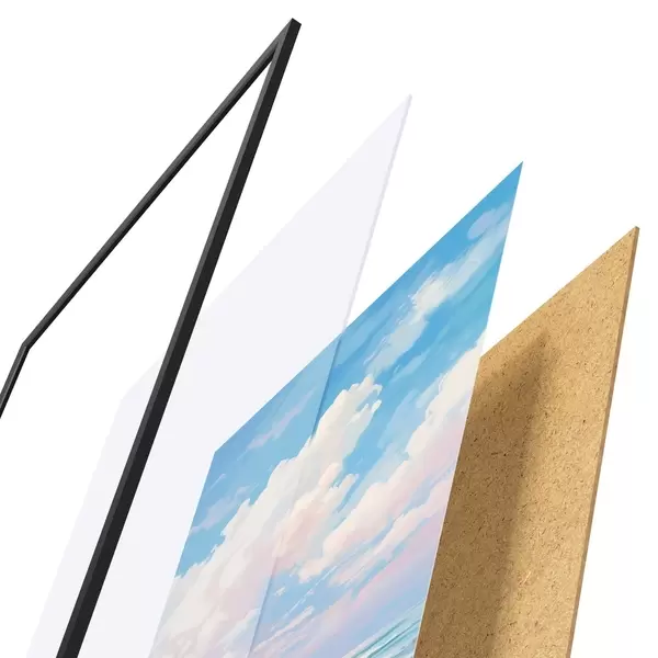 Le poster se compose d'un cadre, d'un plexiglas, d'une image imprimée et d'un support en aggloméré. Le poster peut être immédiatement accroché au mur grâce aux fixations au dos.