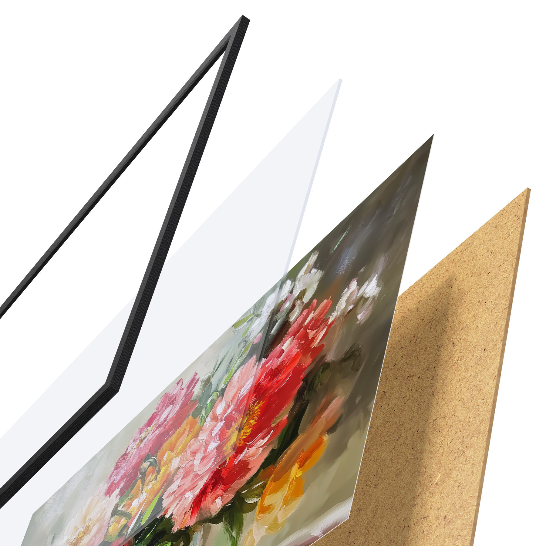 Le poster se compose d'un cadre, d'un plexiglas, d'une image imprimée et d'un support en aggloméré. Le poster peut être immédiatement accroché au mur grâce aux fixations au dos.