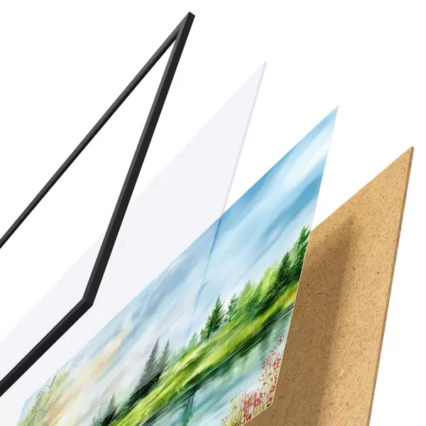 Le poster se compose d'un cadre, d'un plexiglas, d'une image imprimée et d'un support en aggloméré. Le poster peut être immédiatement accroché au mur grâce aux fixations au dos.