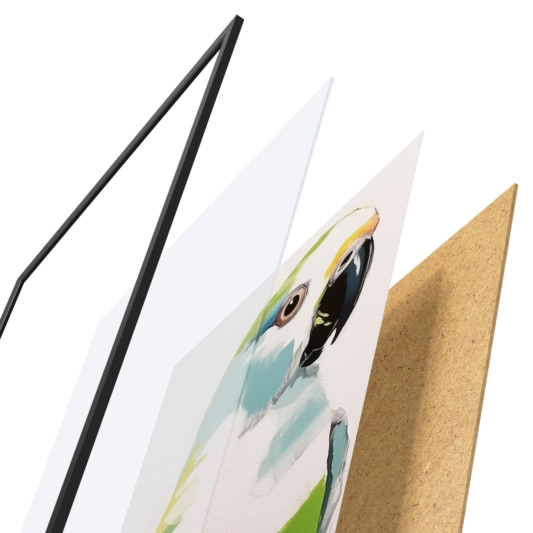 Le poster se compose d'un cadre, d'un plexiglas, d'une image imprimée et d'un support en aggloméré. Le poster peut être immédiatement accroché au mur grâce aux fixations au dos.