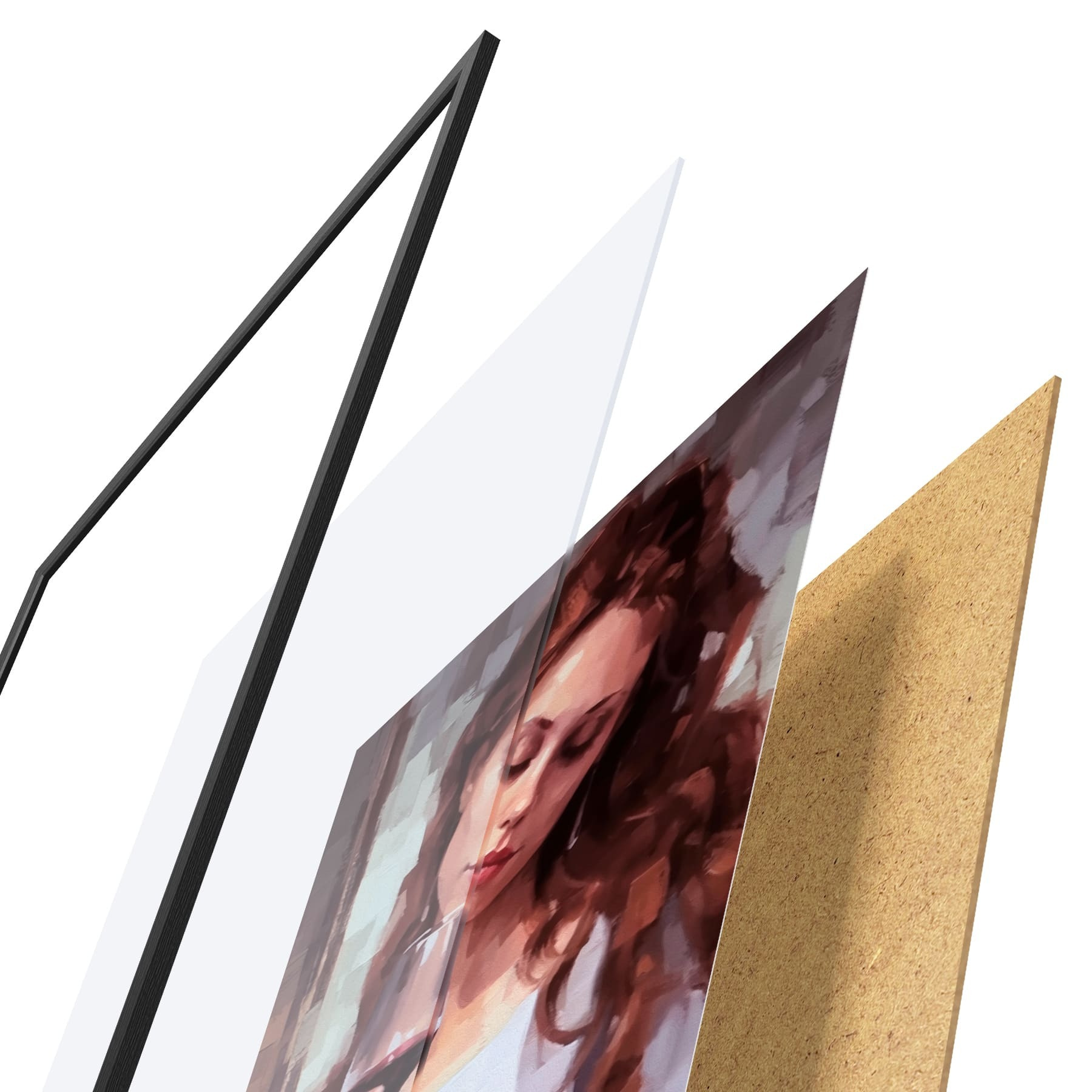 Le poster se compose d'un cadre, d'un plexiglas, d'une image imprimée et d'un support en aggloméré. Le poster peut être immédiatement accroché au mur grâce aux fixations au dos.