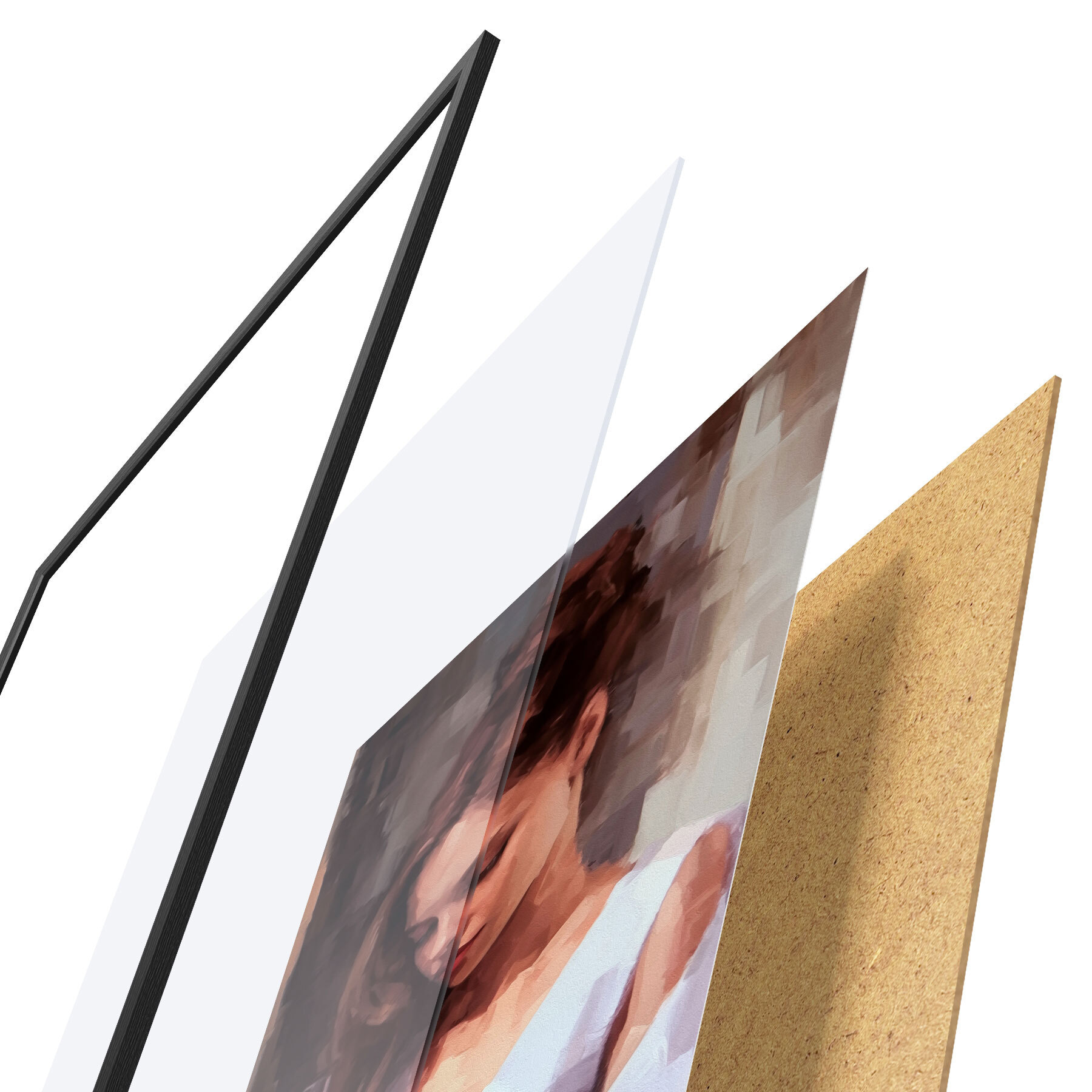 Le poster se compose d'un cadre, d'un plexiglas, d'une image imprimée et d'un support en aggloméré. Le poster peut être immédiatement accroché au mur grâce aux fixations au dos.