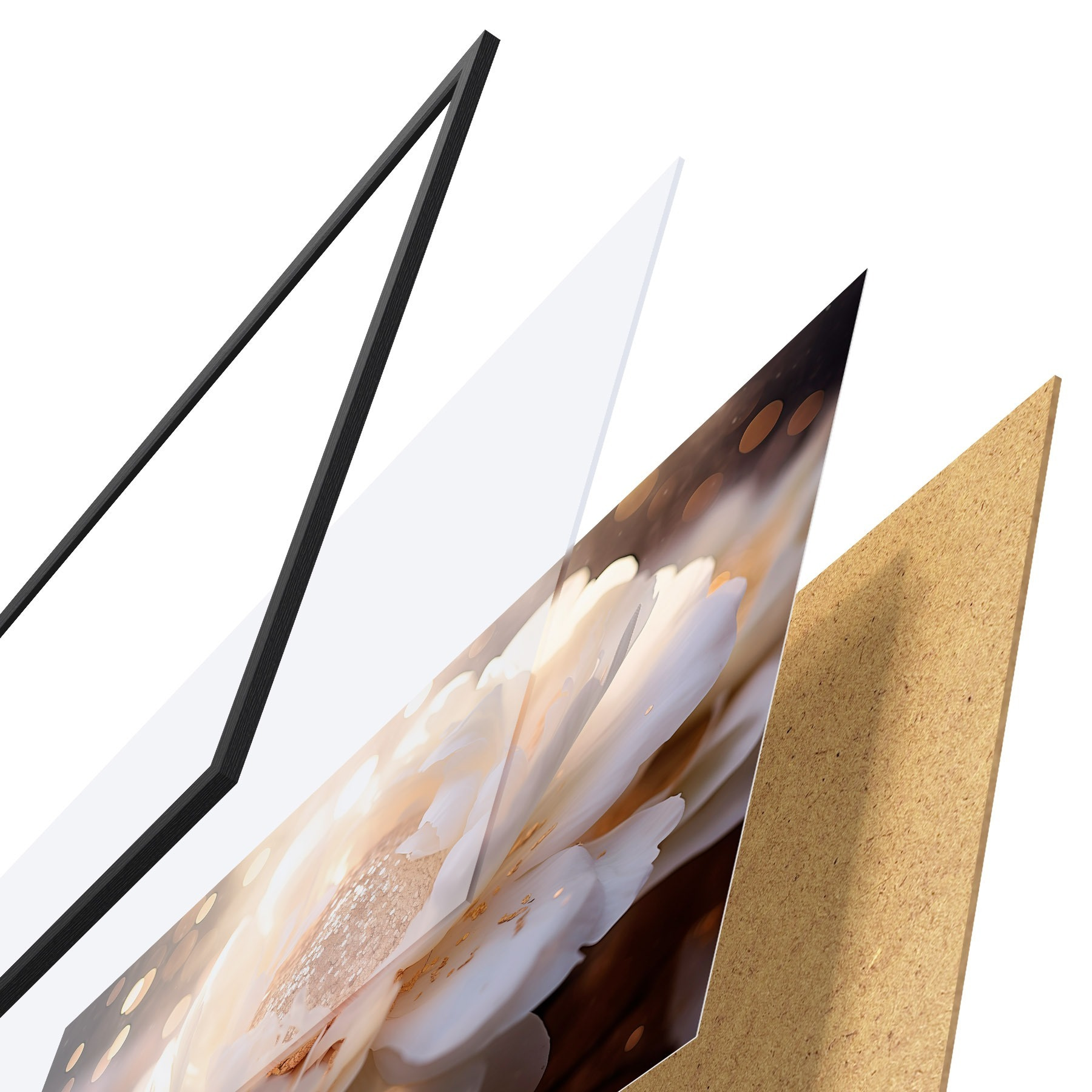 Le poster se compose d'un cadre, d'un plexiglas, d'une image imprimée et d'un support en aggloméré. Le poster peut être immédiatement accroché au mur grâce aux fixations au dos.