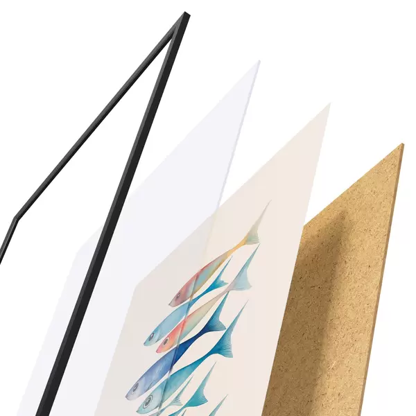 Le poster se compose d'un cadre, d'un plexiglas, d'une image imprimée et d'un support en aggloméré. Le poster peut être immédiatement accroché au mur grâce aux fixations au dos.