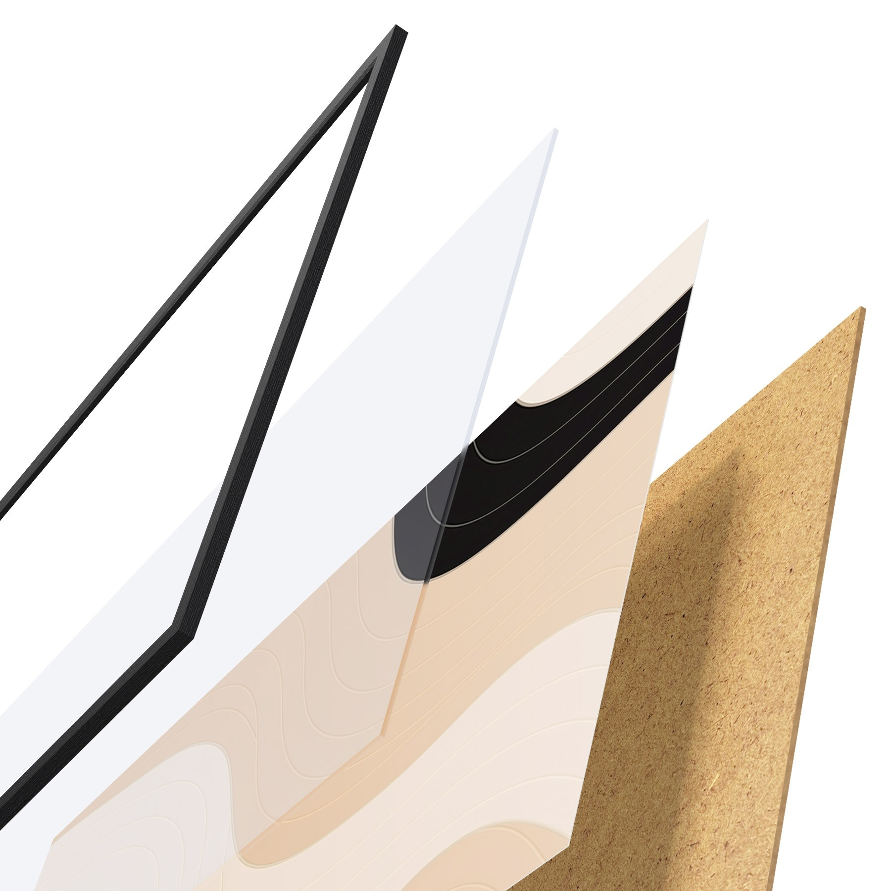 Le poster se compose d'un cadre, d'un plexiglas, d'une image imprimée et d'un support en aggloméré. Le poster peut être immédiatement accroché au mur grâce aux fixations au dos.