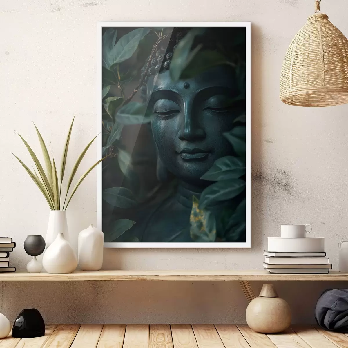 Affiche Bouddha vert dans des feuilles tropicales, réalisme Non f44005