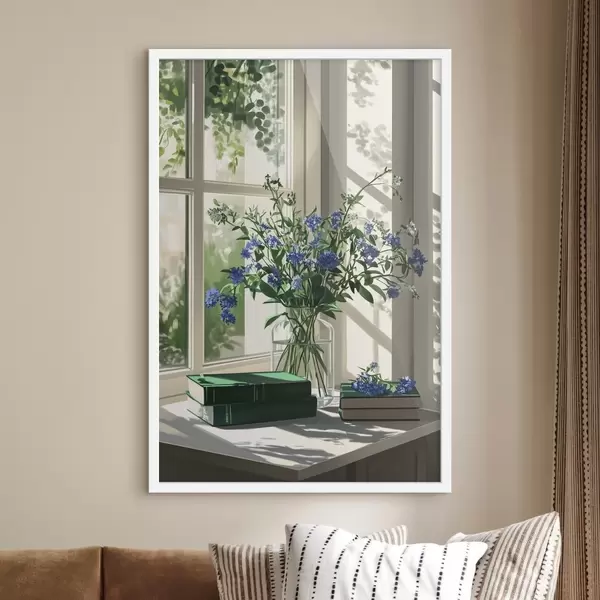 Affiche Livres et fleurs violettes dans le vase sur le rebord de la fenêtre, verdure Non f44008