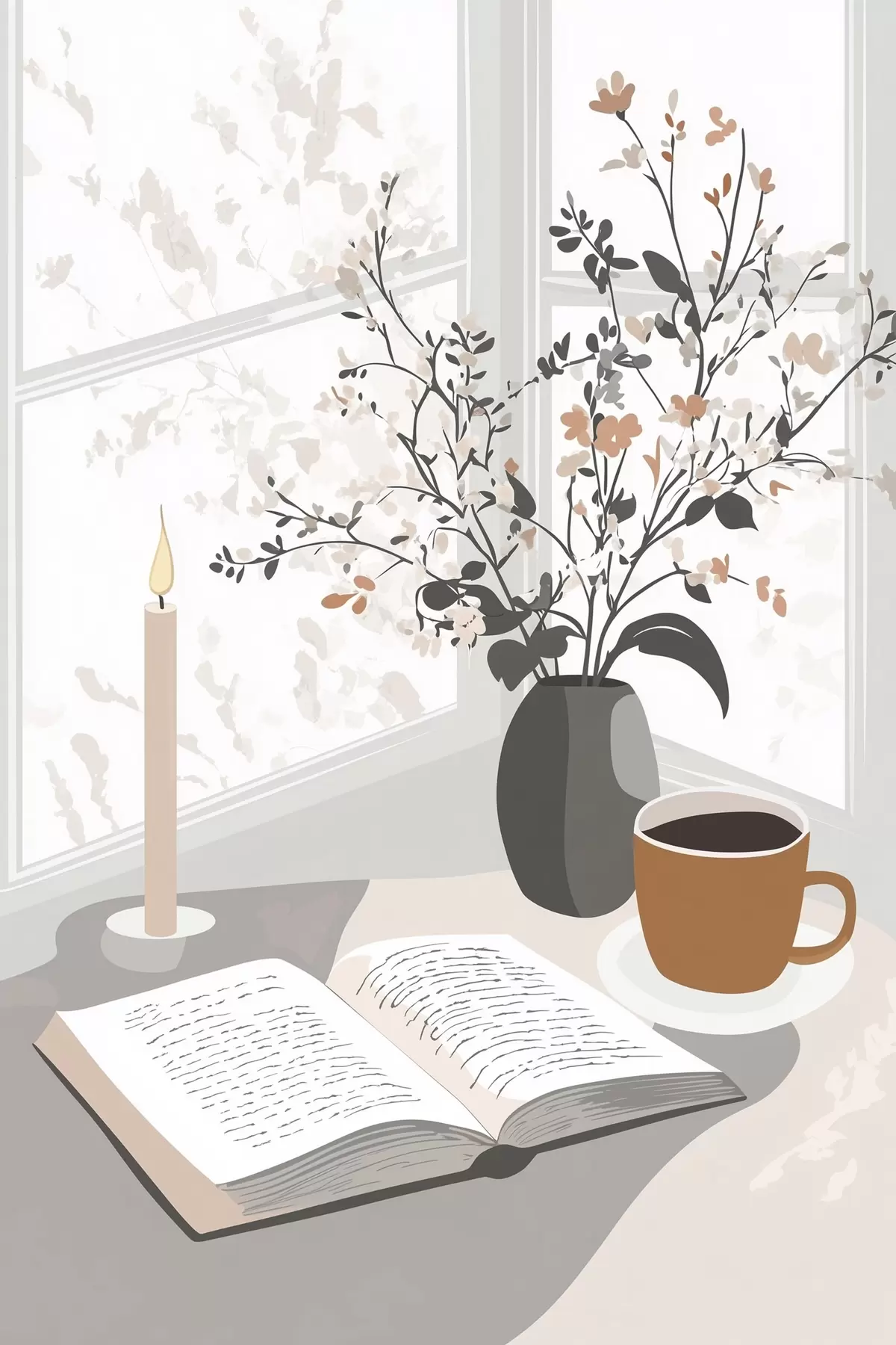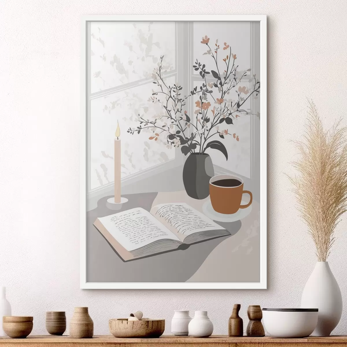 Affiche Abstraction, livre ouvert, vase avec fleurs, bougie, couleurs beiges f44011