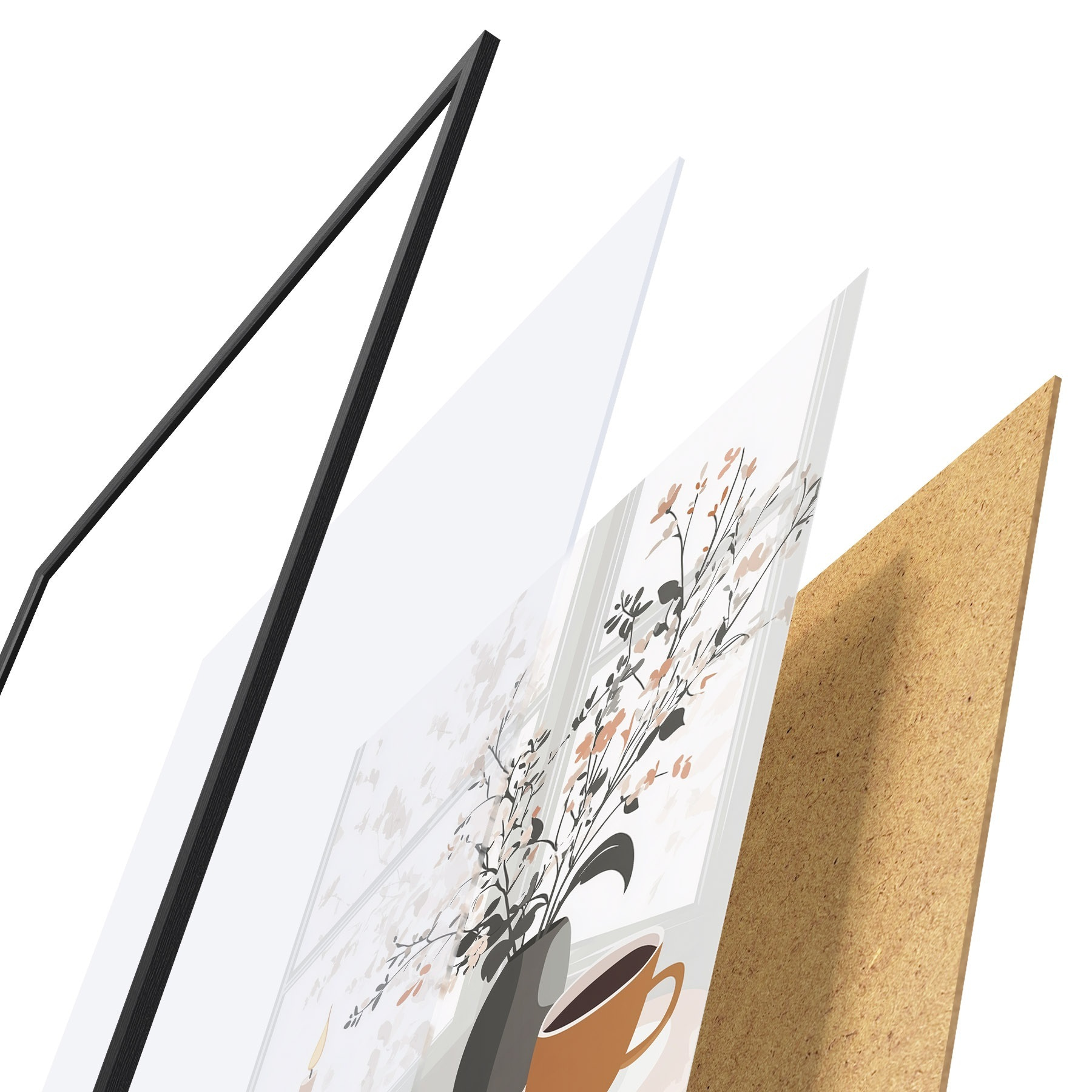 Le poster se compose d'un cadre, d'un plexiglas, d'une image imprimée et d'un support en aggloméré. Le poster peut être immédiatement accroché au mur grâce aux fixations au dos.