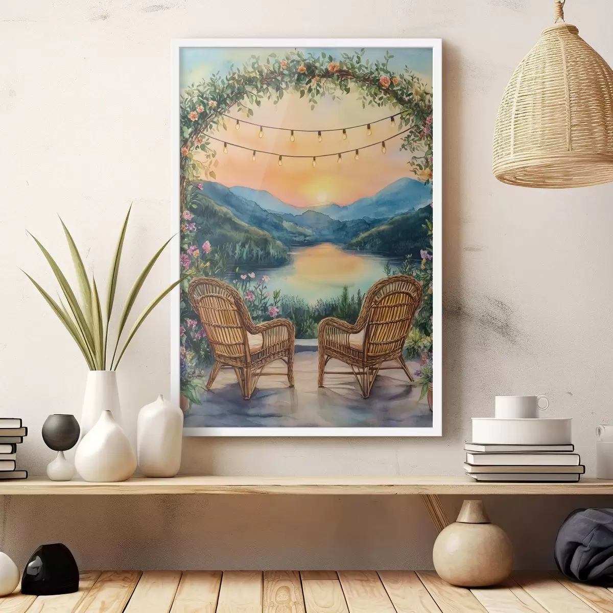 Affiche Chaises en osier au coucher du soleil, paysage de montagne, style boho f44020