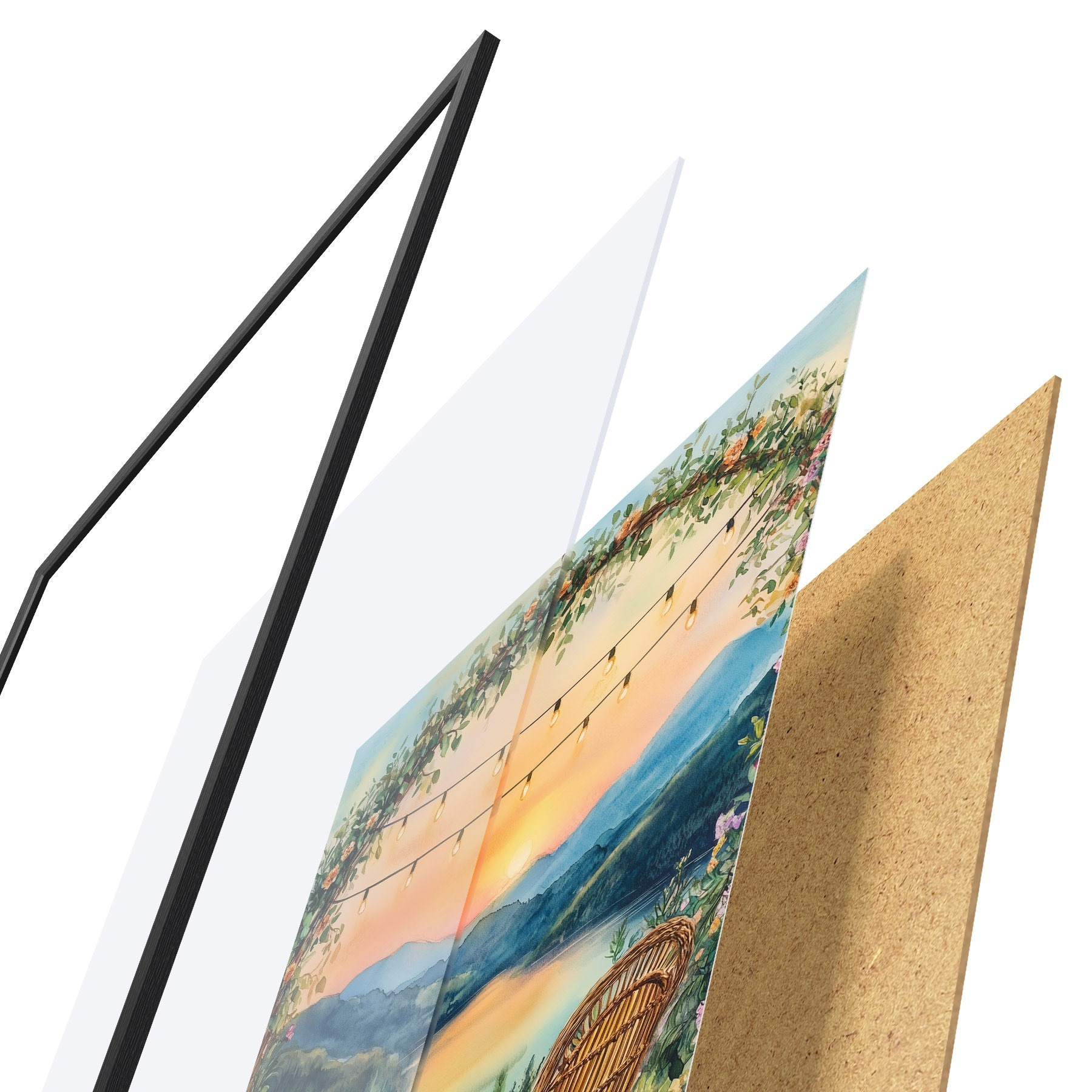 Le poster se compose d'un cadre, d'un plexiglas, d'une image imprimée et d'un support en aggloméré. Le poster peut être immédiatement accroché au mur grâce aux fixations au dos.
