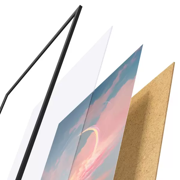 Le poster se compose d'un cadre, d'un plexiglas, d'une image imprimée et d'un support en aggloméré. Le poster peut être immédiatement accroché au mur grâce aux fixations au dos.